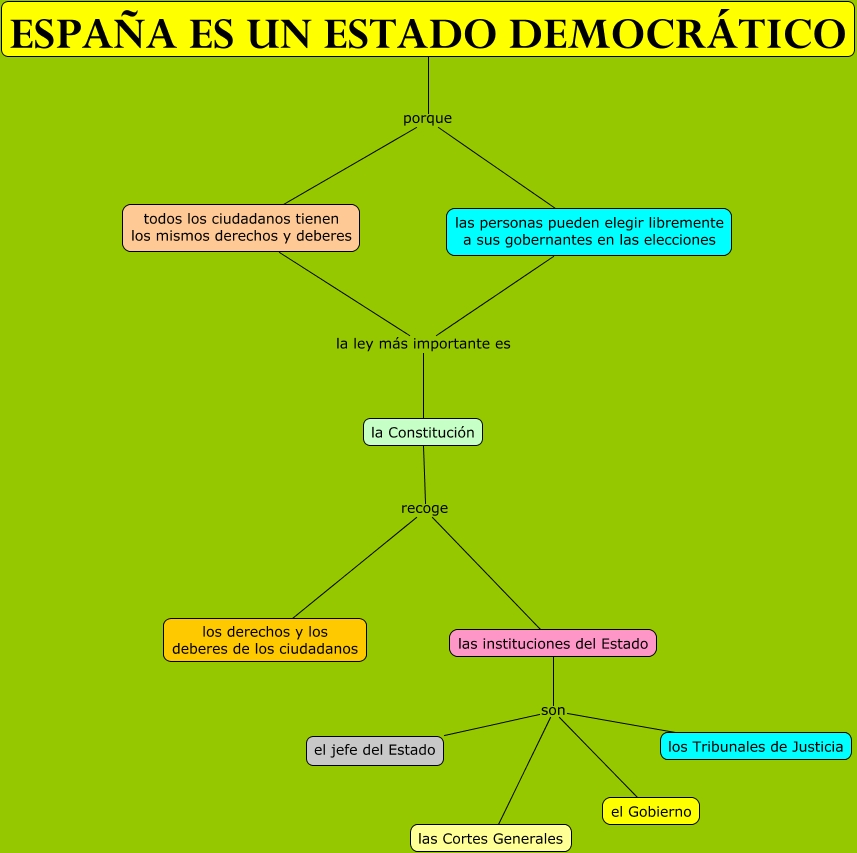 Este Cmap, tiene información relacionada con: España es un Estado democrático, las instituciones del Estado son las Cortes Generales, ESPAÑA ES UN ESTADO DEMOCRÁTICO porque las personas pueden elegir libremente a sus gobernantes en las elecciones, la Constitución recoge las instituciones del Estado, las personas pueden elegir libremente a sus gobernantes en las elecciones la ley más importante es la Constitución, las instituciones del Estado son los Tribunales de Justicia, las instituciones del Estado son el Gobierno, ESPAÑA ES UN ESTADO DEMOCRÁTICO porque todos los ciudadanos tienen los mismos derechos y deberes, todos los ciudadanos tienen los mismos derechos y deberes la ley más importante es la Constitución, las instituciones del Estado son el jefe del Estado, la Constitución recoge los derechos y los deberes de los ciudadanos