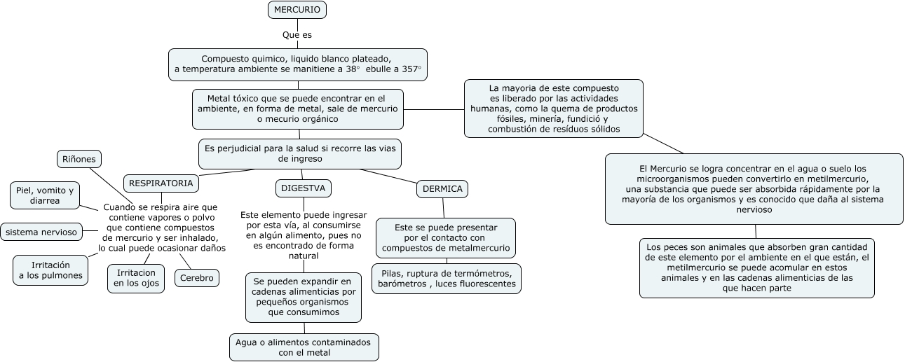 Este Cmap, tiene información relacionada con: mercurio, RESPIRATORIA Cuando se respira aire que contiene vapores o polvo que contiene compuestos de mercurio y ser inhalado, lo cual puede ocasionar daños Irritacion en los ojos, Metal tóxico que se puede encontrar en el ambiente, en forma de metal, sale de mercurio o mecurio orgánico ???? Es perjudicial para la salud si recorre las vias de ingreso, RESPIRATORIA Cuando se respira aire que contiene vapores o polvo que contiene compuestos de mercurio y ser inhalado, lo cual puede ocasionar daños Riñones, Es perjudicial para la salud si recorre las vias de ingreso ???? RESPIRATORIA, RESPIRATORIA Cuando se respira aire que contiene vapores o polvo que contiene compuestos de mercurio y ser inhalado, lo cual puede ocasionar daños sistema nervioso, Compuesto quimico, liquido blanco plateado, a temperatura ambiente se manitiene a 38° ebulle a 357° ???? Metal tóxico que se puede encontrar en el ambiente, en forma de metal, sale de mercurio o mecurio orgánico, RESPIRATORIA Cuando se respira aire que contiene vapores o polvo que contiene compuestos de mercurio y ser inhalado, lo cual puede ocasionar daños Cerebro, Este se puede presentar por el contacto con compuestos de metalmercurio ???? Pilas, ruptura de termómetros, barómetros , luces fluorescentes, La mayoria de este compuesto es liberado por las actividades humanas, como la quema de productos fósiles, minería, fundició y combustión de resíduos sólidos ???? El Mercurio se logra concentrar en el agua o suelo los microorganismos pueden convertirlo en metilmercurio, una substancia que puede ser absorbida rápidamente por la mayoría de los organismos y es conocido que daña al sistema nervioso, Se pueden expandir en cadenas alimenticias por pequeños organismos que consumimos ???? Agua o alimentos contaminados con el metal, Metal tóxico que se puede encontrar en el ambiente, en forma de metal, sale de mercurio o mecurio orgánico ???? La mayoria de este compuesto es liberado por las actividades humanas, como la quema de productos fósiles, minería, fundició y combustión de resíduos sólidos, Es perjudicial para la salud si recorre las vias de ingreso ???? DERMICA, DIGESTVA Este elemento puede ingresar por esta vía, al consumirse en algún alimento, pues no es encontrado de forma natural Se pueden expandir en cadenas alimenticias por pequeños organismos que consumimos, MERCURIO Que es Compuesto quimico, liquido blanco plateado, a temperatura ambiente se manitiene a 38° ebulle a 357°, El Mercurio se logra concentrar en el agua o suelo los microorganismos pueden convertirlo en metilmercurio, una substancia que puede ser absorbida rápidamente por la mayoría de los organismos y es conocido que daña al sistema nervioso ???? Los peces son animales que absorben gran cantidad de este elemento por el ambiente en el que están, el metilmercurio se puede acomular en estos animales y en las cadenas alimenticias de las que hacen parte, RESPIRATORIA Cuando se respira aire que contiene vapores o polvo que contiene compuestos de mercurio y ser inhalado, lo cual puede ocasionar daños Piel, vomito y diarrea, Es perjudicial para la salud si recorre las vias de ingreso ???? DIGESTVA, RESPIRATORIA Cuando se respira aire que contiene vapores o polvo que contiene compuestos de mercurio y ser inhalado, lo cual puede ocasionar daños Irritación a los pulmones, DERMICA ???? Este se puede presentar por el contacto con compuestos de metalmercurio