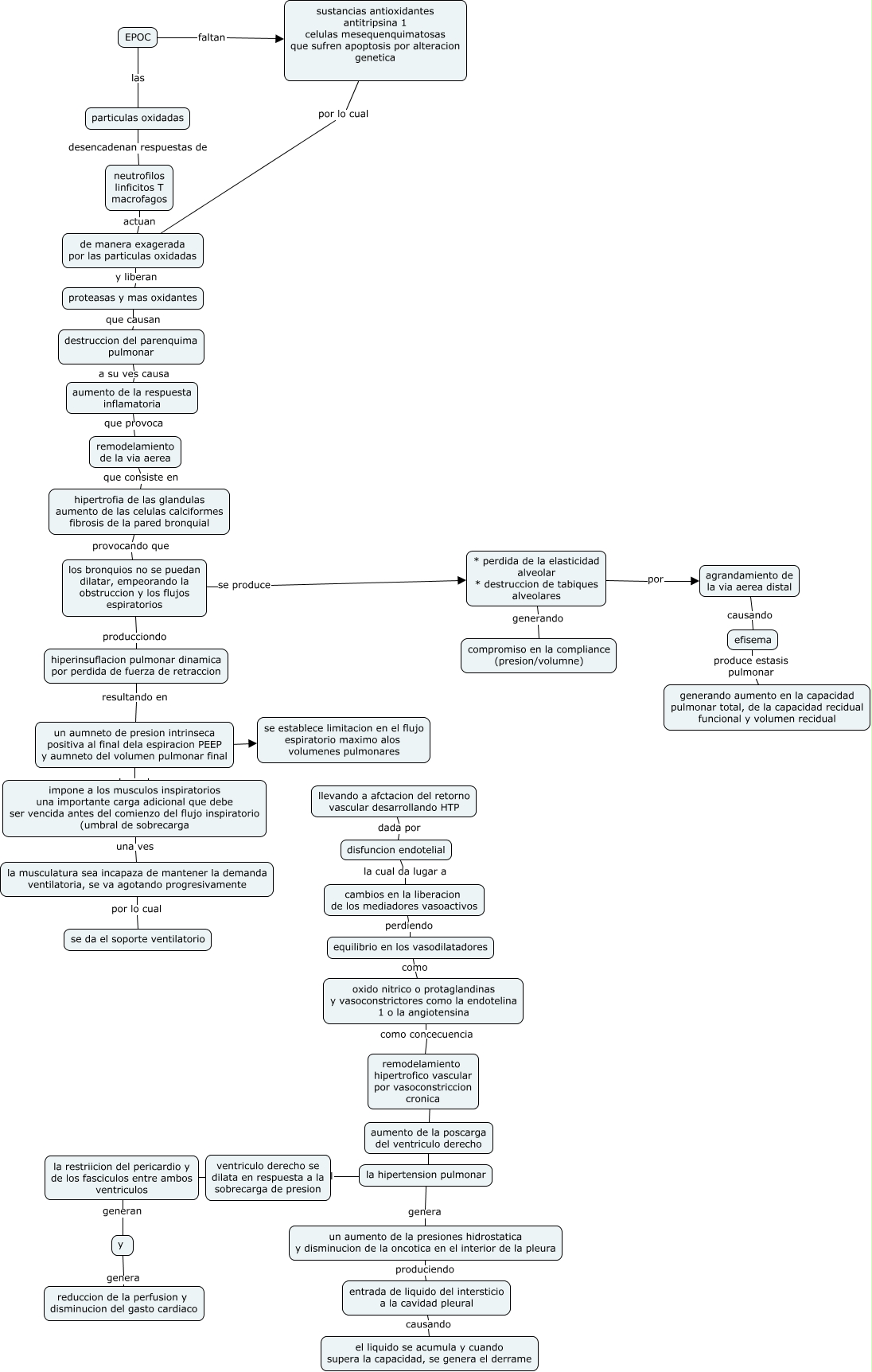 Este Cmap, tiene información relacionada con: fisiopatologia EPOC, cambios en la liberacion de los mediadores vasoactivos perdiendo equilibrio en los vasodilatadores, de manera exagerada por las particulas oxidadas y liberan proteasas y mas oxidantes, hiperinsuflacion pulmonar dinamica por perdida de fuerza de retraccion resultando en un aumneto de presion intrinseca positiva al final dela espiracion PEEP y aumneto del volumen pulmonar final, efisema produce estasis pulmonar generando aumento en la capacidad pulmonar total, de la capacidad recidual funcional y volumen recidual, particulas oxidadas desencadenan respuestas de neutrofilos linficitos T macrofagos, los bronquios no se puedan dilatar, empeorando la obstruccion y los flujos espiratorios producciondo hiperinsuflacion pulmonar dinamica por perdida de fuerza de retraccion, disfuncion endotelial la cual da lugar a cambios en la liberacion de los mediadores vasoactivos, la hipertension pulmonar el ventriculo derecho se dilata en respuesta a la sobrecarga de presion, neutrofilos linficitos T macrofagos actuan de manera exagerada por las particulas oxidadas, hipertrofia de las glandulas aumento de las celulas calciformes fibrosis de la pared bronquial provocando que los bronquios no se puedan dilatar, empeorando la obstruccion y los flujos espiratorios, sustancias antioxidantes antitripsina 1 celulas mesequenquimatosas que sufren apoptosis por alteracion genetica por lo cual de manera exagerada por las particulas oxidadas, un aumneto de presion intrinseca positiva al final dela espiracion PEEP y aumneto del volumen pulmonar final lo cual impone a los musculos inspiratorios una importante carga adicional que debe ser vencida antes del comienzo del flujo inspiratorio (umbral de sobrecarga, * perdida de la elasticidad alveolar * destruccion de tabiques alveolares por agrandamiento de la via aerea distal, remodelamiento de la via aerea que consiste en hipertrofia de las glandulas aumento de las celulas calciformes fibrosis de la pared bronquial, los bronquios no se puedan dilatar, empeorando la obstruccion y los flujos espiratorios se produce * perdida de la elasticidad alveolar * destruccion de tabiques alveolares, llevando a afctacion del retorno vascular desarrollando HTP dada por disfuncion endotelial, proteasas y mas oxidantes que causan destruccion del parenquima pulmonar, entrada de liquido del intersticio a la cavidad pleural causando el liquido se acumula y cuando supera la capacidad, se genera el derrame, un aumneto de presion intrinseca positiva al final dela espiracion PEEP y aumneto del volumen pulmonar final ???? se establece limitacion en el flujo espiratorio maximo alos volumenes pulmonares, un aumento de la presiones hidrostatica y disminucion de la oncotica en el interior de la pleura produciendo entrada de liquido del intersticio a la cavidad pleural