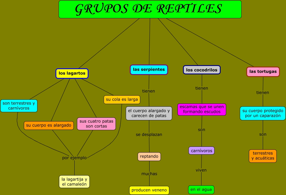 Este Cmap, tiene información relacionada con: Grupos de reptiles, los lagartos son terrestres y carnívoros, su cuerpo es alargado por ejemplo la lagartija y el camaleón, los lagartos su cola es larga, los lagartos su cuerpo es alargado, GRUPOS DE REPTILES las serpientes, escamas que se unen formando escudos son carnívoros, GRUPOS DE REPTILES los lagartos, sus cuatro patas son cortas por ejemplo la lagartija y el camaleón, las serpientes tienen el cuerpo alargado y carecen de patas, su cuerpo protegido por un caparazón son terrestres y acuáticas, el cuerpo alargado y carecen de patas se desplazan reptando, los lagartos sus cuatro patas son cortas, reptando muchas producen veneno, GRUPOS DE REPTILES los cocodrilos, GRUPOS DE REPTILES las tortugas, los cocodrilos tienen escamas que se unen formando escudos, carnívoros viven en el agua, su cola es larga por ejemplo la lagartija y el camaleón, las tortugas tienen su cuerpo protegido por un caparazón, son terrestres y carnívoros por ejemplo la lagartija y el camaleón