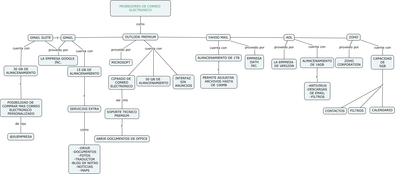 Este Cmap, tiene información relacionada con: PROVEDORES DE CORREO ELECTRONICO, ZOHO proveido por ZOHO CORPORATION, SOPORTE TECNICO PREMIUM y ABRIR DOCUMENTOS DE OFFICE, GMAIL SUITE proveido por LA EMPRESA GOOGLE INC., OUTLOOK PREMIUM proveido por MICROSOFT, GMAIL cuenta con 15 GB DE ALMACENAMIENTO, OUTLOOK PREMIUM cuenta con CIFRADO DE CORREO ELECTRONICO, GMAIL proveido por LA EMPRESA GOOGLE INC., YAHOO MAIL proveido por EMPRESA OATH INC., CAPACIDAD DE 5GB y CONTACTOS, PROBEDORES DE CORREO ELECTRONICO como OUTLOOK PREMIUM, AOL ???? ZOHO, 30 GB DE ALMACENAMIENTO y POSIBILIDAD DE COMPRAR MAS CORREO ELECTRONICO PERSONALIZADO, ALMACENAMIENTO DE 16GB y -ANTIVIRUS -DESCARGAS DE EMAIL -FILTROS, GMAIL SUITE y OUTLOOK PREMIUM, POSIBILIDAD DE COMPRAR MAS CORREO ELECTRONICO PERSONALIZADO de tipo @SUEMPRESA, CIFRADO DE CORREO ELECTRONICO asi cmo SOPORTE TECNICO PREMIUM, 15 GB DE ALMACENAMIENTO y SERVICIOS EXTRA, ZOHO cuenta con CAPACIDAD DE 5GB, OUTLOOK PREMIUM ???? YAHOO MAIL, YAHOO MAIL ???? AOL