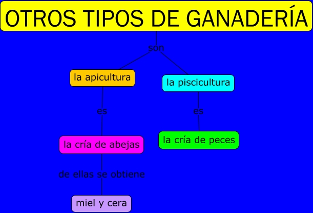 Este Cmap, tiene información relacionada con: Otros tipos de ganadería, la piscicultura es la cría de peces, la cría de abejas de ellas se obtiene miel y cera, OTROS TIPOS DE GANADERÍA son la piscicultura, la apicultura es la cría de abejas, OTROS TIPOS DE GANADERÍA son la apicultura