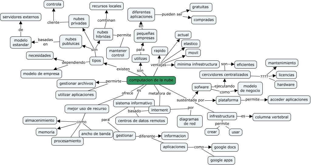 Este Cmap, tiene información relacionada con: mapa conceptual computacion en la nube, cercvidores centralizados son eficientes, nubes hibridas combinan recursos locales, sistema informativo basado centros de datos remotos, sofware ejecutando cercvidores centralizados, nubes privadas cliente controla, plataforma permite acceder aplicaciones, cercvidores centralizados ???? licencias, pequeñas empresas en diferentes aplicaciones, gestionar diferente informacion, aplicaciones como google apps, internent por diagramas de red, computacion de la nube permirte utilizar aplicaciones, utilizas para pequeñas empresas, mejor uso de recurso como ancho de banda, computacion de la nube son utilizas, computacion de la nube ventajas minima infrestructura, diferentes aplicaciones pueden ser gratuitas, cercvidores centralizados son eficientes, infrestructura permite usar, nubes publuicas basadas en modelo estandar