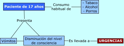 Este Cmap, tiene información relacionada con: Alberto, Paciente de 17 años Presenta Vómitos, Vómitos ???? Disminución del nivel de consciencia, Disminución del nivel de consciencia Es llevada a URGENCIAS, Paciente de 17 años Presenta Disminución del nivel de consciencia, Paciente de 17 años Consumo habitual de - Tabaco - Alcohol - Porros