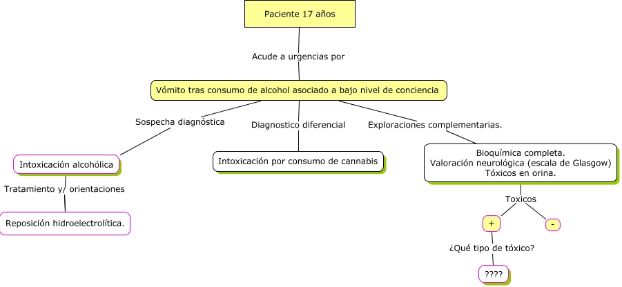 Este Cmap, tiene información relacionada con: Virginia Jano, Bioquímica completa. Valoración neurológica (escala de Glasgow) Tóxicos en orina. Toxicos -, Vómito tras consumo de alcohol asociado a bajo nivel de conciencia Sospecha diagnóstica Intoxicación alcohólica, Bioquímica completa. Valoración neurológica (escala de Glasgow) Tóxicos en orina. Toxicos +, Vómito tras consumo de alcohol asociado a bajo nivel de conciencia Diagnostico diferencial Intoxicación por consumo de cannabis, + ¿Qué tipo de tóxico? ????, Intoxicación alcohólica Tratamiento y/ orientaciones Reposición hidroelectrolítica., Paciente 17 años Acude a urgencias por Vómito tras consumo de alcohol asociado a bajo nivel de conciencia, Vómito tras consumo de alcohol asociado a bajo nivel de conciencia Exploraciones complementarias. Bioquímica completa. Valoración neurológica (escala de Glasgow) Tóxicos en orina.