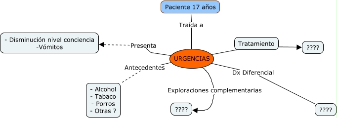 Este Cmap, tiene información relacionada con: Julia, URGENCIAS Antecedentes - Alcohol - Tabaco - Porros - Otras ?, URGENCIAS Presenta - Disminución nivel conciencia -Vómitos, URGENCIAS Dx Diferencial ????, Paciente 17 años Traída a URGENCIAS, URGENCIAS ???? ????, URGENCIAS Exploraciones complementarias ????