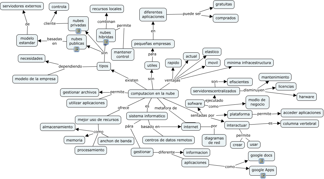 Este Cmap, tiene información relacionada con: mapa conceptual, computacion en la nube, nubes publicas basadas en modelo estandar, sistema informatico pára gestionar, computacion en la nube ventajas elastico, interactuar permite usar, tipos dependiendo necesidades, gestionar diferente informacion, aplicaciones como google docs, mejor uso de recursos como almacenamiento, sofware como modlo de negocio, nubes hibridas combinan recursos locales, diferentes aplicaciones puede ser gratuitas, computacion en la nube ventajas minima infracestructura, computacion en la nube metafora de ????, nubes hibridas permite mantener control, interactuar es columna vertebral, diferentes aplicaciones puede ser comprados, tipos son nubes hibridas, computacion en la nube ventajas movil, computacion en la nube existen tipos, servidorescentralizados disminuyen harware
