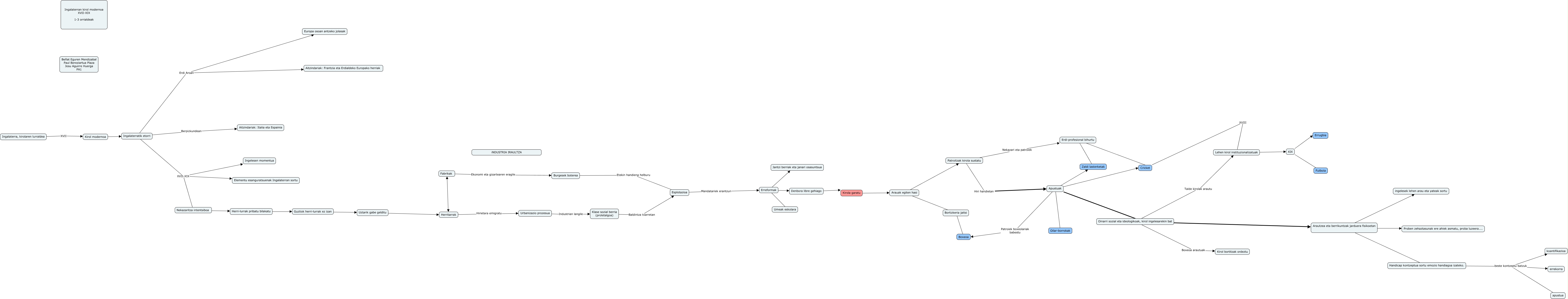 Este Cmap, tiene información relacionada con: PA1-Aguirre-Historia 1-3, Ingalaterratik etorri XVII-XIX Ingelesen momentua, Lehen kirol instituzionalizatuak XVIII Cricket, Arautzea eta berrikuntzak jarduera fisikoetan ingelesek lehen arau eta yateak sortu, Apustuak Oinarri sozial eta ideologikoak, kirol ingelesarekin bat, Arautzea eta berrikuntzak jarduera fisikoetan Handicap kontzeptua sortu emozio handiagoa izateko., Guztiok herri-lurrak ez izan Uztarik gabe gelditu, Erdi-profesional bihurtu Zaldi lasterketak, Ingalaterratik etorri XVII-XIX Elementu esanguratsuenak Ingalaterran sortu, XIX Futbola, Urbanizazio prozesua Industrian langile Klase sozial berria (proletalgoa), Kirola garatu Arauak egiten hasi, Oinarri sozial eta ideologikoak, kirol ingelesarekin bat Arautzea eta berrikuntzak jarduera fisikoetan, Denbora libre gehiago Kirola garatu, Esplotazioa Mandatariek erantzun Erreformak, Ingalaterra, kirolaren lurraldea XVII Kirol modernoa, Apustuak Cricket, Burgesek boterea Etekin handiena helburu Esplotazioa, Apustuak Patroiek boxeolariak babestu Boxeoa, Patroitzak kirola sustatu Hiri handietan Apustuak, Bortizkeria jaitsi Boxeoa