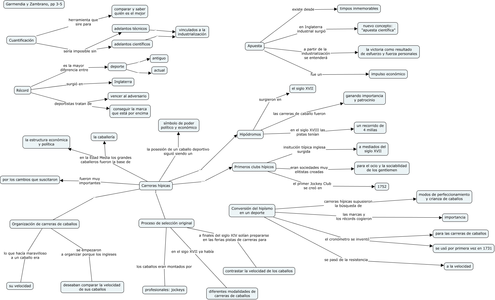 Este Cmap, tiene información relacionada con: C-Garmendia-DeplMod1-3-5, Cuantificación sería imposible sin adelantos técnicos, Carreras hípicas en la Edad Media los grandes caballeros fueron la base de la estructura económica y política, Proceso de selección original a finales del siglo XIV solían prepararse en las ferias pistas de carreras para contrastar la velocidad de los caballos, Carreras hípicas - Organización de carreras de caballos, Hipódromos en el siglo XVIII las pistas tenían un recorrido de 4 millas, Récord es la mayor diferencia entre deporte, Récord surgió en Inglaterra, Carreras hípicas en la Edad Media los grandes caballeros fueron la base de la caballería, Conversión del hipísmo en un deporte las marcas y los récords cogieron importancia, Apuesta existe desde timpos inmemorables, Organización de carreras de caballos lo que hacía maravilloso a un caballo era su velocidad, Proceso de selección original en el sigo XVII ya había diferentes modalidades de carreras de caballos, Conversión del hipísmo en un deporte se pasó de la resistencia a la velocidad, Primeros clubs hípicos eran sociedades muy elitistas creadas para el ocio y la sociabilidad de los gentlemen, Conversión del hipísmo en un deporte carreras hípicas supusieron la búsqueda de modos de perfeccionamiento y crianza de caballos, Cuantificación sería imposible sin adelantos científicos, Récord deportistas tratan de conseguir la marca que está por encima, Apuesta a partir de la industrialización se entenderá la victoria como resultado de esfuerzo y fuerza personales, Primeros clubs hípicos el primer Jockey Club se creó en 1752, Carreras hípicas - Proceso de selección original