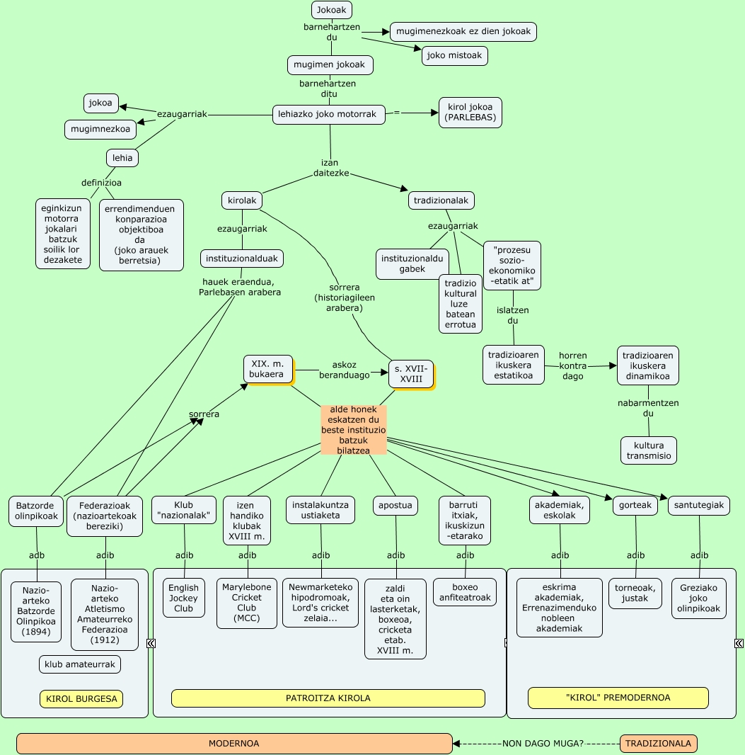 Este Cmap, tiene información relacionada con: kiroltze1eusk_nue.cmap, XIX. m. bukaera askoz beranduago s. XVII- XVIII, Batzorde olinpikoak adb Nazio- arteko Batzorde Olinpikoa (1894), tradizionalak ezaugarriak instituzionaldu gabek, XIX. m. bukaera alde honek eskatzen du beste instituzio batzuk bilatzea barruti itxiak, ikuskizun -etarako, kirolak sorrera (historiagileen arabera) s. XVII- XVIII, akademiak, eskolak adib eskrima akademiak, Errenazimenduko nobleen akademiak, XIX. m. bukaera alde honek eskatzen du beste instituzio batzuk bilatzea izen handiko klubak XVIII m., instituzionalduak hauek eraendua, Parlebasen arabera Batzorde olinpikoak, s. XVII- XVIII alde honek eskatzen du beste instituzio batzuk bilatzea izen handiko klubak XVIII m., kirolak ezaugarriak instituzionalduak, lehiazko joko motorrak ezaugarriak lehia, Klub "nazionalak" adib English Jockey Club, s. XVII- XVIII alde honek eskatzen du beste instituzio batzuk bilatzea instalakuntza ustiaketa, s. XVII- XVIII alde honek eskatzen du beste instituzio batzuk bilatzea santutegiak, lehia definizioa eginkizun motorra jokalari batzuk soilik lor dezakete, tradizionalak ezaugarriak "prozesu sozio- ekonomiko -etatik at", mugimen jokoak barnehartzen ditu lehiazko joko motorrak, XIX. m. bukaera alde honek eskatzen du beste instituzio batzuk bilatzea Klub "nazionalak", lehiazko joko motorrak = kirol jokoa (PARLEBAS), s. XVII- XVIII alde honek eskatzen du beste instituzio batzuk bilatzea barruti itxiak, ikuskizun -etarako