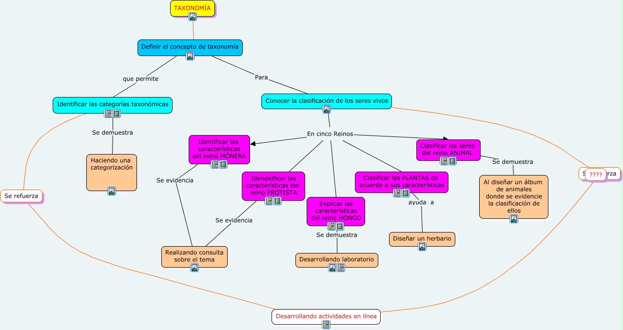 Este Cmap, tiene información relacionada con: TAXONOMÍA, TAXONOMÍA ???? Definir el concepto de taxonomía, Definir el concepto de taxonomía Para Conocer la clasificación de los seres vivos, Identificar las categorías taxonómicas ???? Se refuerza, Se refuerza ???? Desarrollando actividades en línea, Conocer la clasificación de los seres vivos ???? ????, Conocer la clasificación de los seres vivos En cinco Reinos Clasificar las PLANTAS de acuerdo a sus características, Definir el concepto de taxonomía que permite Identificar las categorías taxonómicas, Clasificar los seres del reino ANIMAL Se demuestra Al diseñar un álbum de animales donde se evidencie la clasificación de ellos, TAXONOMÍA ???? Definir el concepto de taxonomía, Explicar las características del reino HONGO Se demuestra Desarrollando laboratorio, Conocer la clasificación de los seres vivos En cinco Reinos Identificar las características del reino MÓNERA, Clasificar las PLANTAS de acuerdo a sus características ayuda a Diseñar un herbario, Conocer la clasificación de los seres vivos En cinco Reinos Clasificar los seres del reino ANIMAL, Identificar las características del reino MÓNERA Se evidencia Realizando consulta sobre el tema, Conocer la clasificación de los seres vivos En cinco Reinos Explicar las características del reino HONGO, Identificar las categorías taxonómicas Se demuestra Haciendo una categorización, Conocer la clasificación de los seres vivos En cinco Reinos Idendeificar las características del reino PROTISTA, Idendeificar las características del reino PROTISTA Se evidencia Realizando consulta sobre el tema, Se refuerza ???? Desarrollando actividades en línea, TAXONOMÍA ???? Definir el concepto de taxonomía