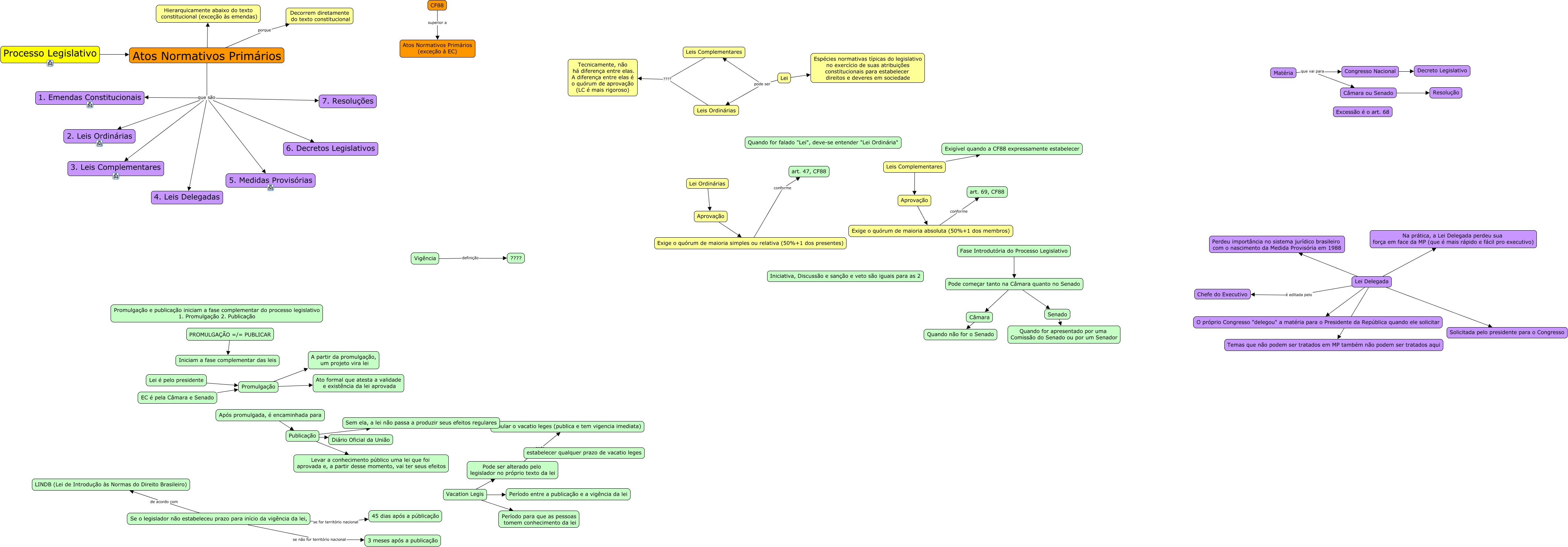 Esse mapa conceitual, produzido no IHMC CmapTools, tem a informação relacionada a: PL - ATOS NORMATIVOS PRIMÁRIOS, Atos Normativos Primários que são 5. Medidas Provisórias, Leis Ordinárias ???? Tecnicamente, não há diferença entre elas. A diferença entre elas é o quórum de aprovação (LC é mais rigoroso), Pode começar tanto na Câmara quanto no Senado Câmara, Aprovação Exige o quórum de maioria absoluta (50%+1 dos membros), Leis Complementares ???? Tecnicamente, não há diferença entre elas. A diferença entre elas é o quórum de aprovação (LC é mais rigoroso), Câmara Quando não for o Senado, Lei Delegada Na prática, a Lei Delegada perdeu sua força em face da MP (que é mais rápido e fácil pro executivo), Lei Delegada Perdeu importância no sistema jurídico brasileiro com o nascimento da Medida Provisória em 1988, Vacation Legis Período para que as pessoas tomem conhecimento da lei, Atos Normativos Primários Hierarquicamente abaixo do texto constitucional (exceção às emendas), Matéria que vai para Câmara ou Senado, Vigência definição ????, Atos Normativos Primários que são 2. Leis Ordinárias, Após promulgada, é encaminhada para Publicação, Leis Complementares Aprovação, Atos Normativos Primários porque Decorrem diretamente do texto constitucional, Atos Normativos Primários que são 1. Emendas Constitucionais, Aprovação Exige o quórum de maioria simples ou relativa (50%+1 dos presentes), Exige o quórum de maioria absoluta (50%+1 dos membros) conforme art. 69, CF88, Se o legislador não estabeleceu prazo para início da vigência da lei, se não for território nacional 3 meses após a publicação