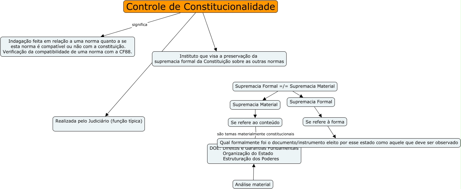 Esse mapa conceitual, produzido no IHMC CmapTools, tem a informação relacionada a: Controles de Constitucionalidade, Supremacia Formal =/= Supremacia Material Supremacia Formal, Supremacia Formal =/= Supremacia Material Supremacia Material, Análise material DOE: Direitos e Garantias Fundamentais Organização do Estado Estruturação dos Poderes, Controle de Constitucionalidade Instituto que visa a preservação da supremacia formal da Constituição sobre as outras normas, Se refere ao conteúdo são temas materialmente constitucionais DOE: Direitos e Garantias Fundamentais Organização do Estado Estruturação dos Poderes, Supremacia Material Se refere ao conteúdo, Controle de Constitucionalidade significa Indagação feita em relação a uma norma quanto a se esta norma é compatível ou não com a constituição. Verificação da compatibilidade de uma norma com a CF88., Supremacia Formal Se refere à forma, Controle de Constitucionalidade Realizada pelo Judiciário (função típica), Se refere à forma Qual formalmente foi o documento/instrumento eleito por esse estado como aquele que deve ser observado