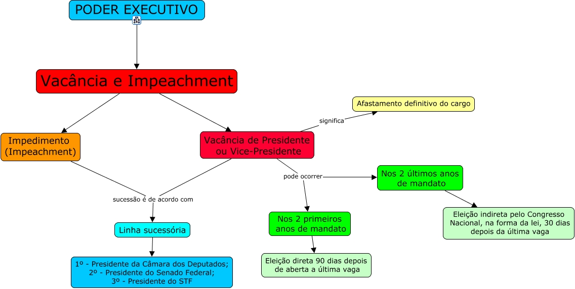Esse mapa conceitual, produzido no IHMC CmapTools, tem a informação relacionada a: Poder Executivo - Vacância e Impeachment, Nos 2 últimos anos de mandato Eleição indireta pelo Congresso Nacional, na forma da lei, 30 dias depois da última vaga, Vacância e Impeachment Vacância de Presidente ou Vice-Presidente, Impedimento (Impeachment) sucessão é de acordo com Linha sucessória, Vacância de Presidente ou Vice-Presidente significa Afastamento definitivo do cargo, Vacância de Presidente ou Vice-Presidente pode ocorrer Nos 2 últimos anos de mandato, Vacância de Presidente ou Vice-Presidente pode ocorrer Nos 2 primeiros anos de mandato, Vacância de Presidente ou Vice-Presidente sucessão é de acordo com Linha sucessória, Nos 2 primeiros anos de mandato Eleição direta 90 dias depois de aberta a última vaga, PODER EXECUTIVO Vacância e Impeachment, Vacância e Impeachment Impedimento (Impeachment), Linha sucessória 1º - Presidente da Câmara dos Deputados; 2º - Presidente do Senado Federal; 3º - Presidente do STF