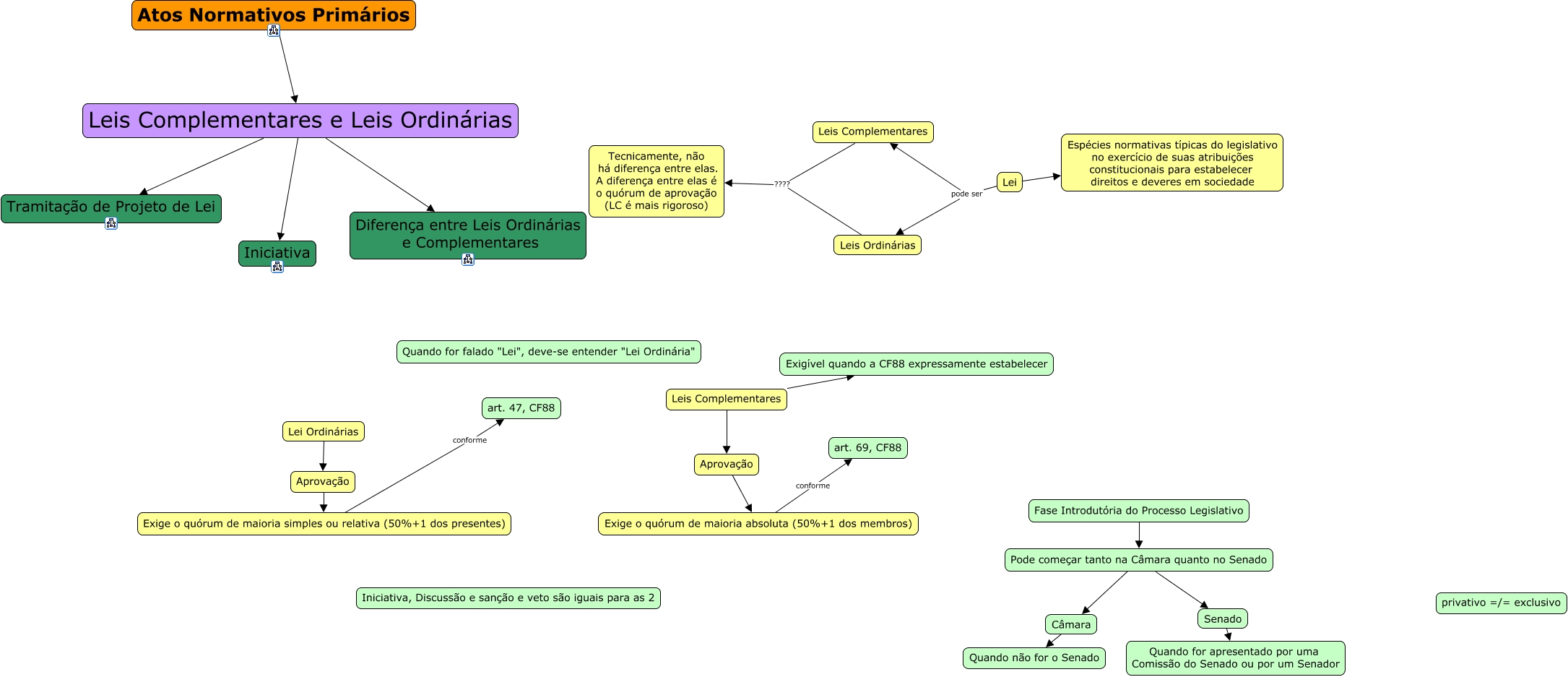 Esse mapa conceitual, produzido no IHMC CmapTools, tem a informação relacionada a: PL - Atos Normativos Primários - Leis Ordinárias e Complementares, Leis Complementares e Leis Ordinárias Tramitação de Projeto de Lei, Aprovação Exige o quórum de maioria absoluta (50%+1 dos membros), Pode começar tanto na Câmara quanto no Senado Senado, Lei Espécies normativas típicas do legislativo no exercício de suas atribuições constitucionais para estabelecer direitos e deveres em sociedade, Leis Complementares e Leis Ordinárias Iniciativa, Aprovação Exige o quórum de maioria simples ou relativa (50%+1 dos presentes), Câmara Quando não for o Senado, Fase Introdutória do Processo Legislativo Pode começar tanto na Câmara quanto no Senado, Senado Quando for apresentado por uma Comissão do Senado ou por um Senador, Exige o quórum de maioria simples ou relativa (50%+1 dos presentes) conforme art. 47, CF88, Exige o quórum de maioria absoluta (50%+1 dos membros) conforme art. 69, CF88, Leis Complementares ???? Tecnicamente, não há diferença entre elas. A diferença entre elas é o quórum de aprovação (LC é mais rigoroso), Lei Ordinárias Aprovação, Leis Complementares Aprovação, Lei pode ser Leis Complementares, Leis Complementares e Leis Ordinárias Diferença entre Leis Ordinárias e Complementares, Atos Normativos Primários Leis Complementares e Leis Ordinárias, Lei pode ser Leis Ordinárias, Pode começar tanto na Câmara quanto no Senado Câmara, Leis Complementares Exigível quando a CF88 expressamente estabelecer