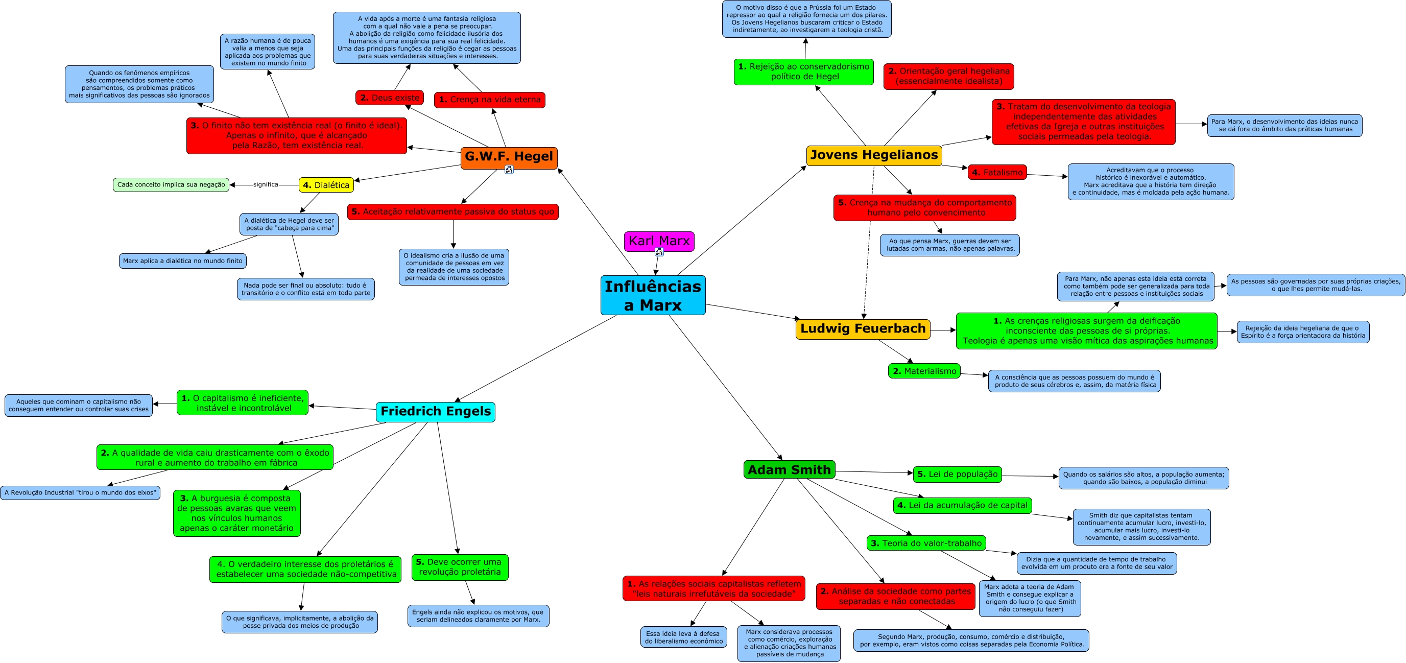 Esse mapa conceitual, produzido no IHMC CmapTools, tem a informação relacionada a: Karl Marx - Influências, 3. Teoria do valor-trabalho Marx adota a teoria de Adam Smith e consegue explicar a origem do lucro (o que Smith não conseguiu fazer), 5. Crença na mudança do comportamento humano pelo convencimento Ao que pensa Marx, guerras devem ser lutadas com armas, não apenas palavras., 5. Deve ocorrer uma revolução proletária Engels ainda não explicou os motivos, que seriam delineados claramente por Marx., Ludwig Feuerbach 2. Materialismo, Jovens Hegelianos 3. Tratam do desenvolvimento da teologia independentemente das atividades efetivas da Igreja e outras instituições sociais permeadas pela teologia., 4. Lei da acumulação de capital Smith diz que capitalistas tentam continuamente acumular lucro, investi-lo, acumular mais lucro, investi-lo novamente, e assim sucessivamente., G.W.F. Hegel 3. O finito não tem existência real (o finito é ideal). Apenas o infinito, que é alcançado pela Razão, tem existência real., Adam Smith 5. Lei de população, 1. As crenças religiosas surgem da deificação inconsciente das pessoas de si próprias. Teologia é apenas uma visão mítica das aspirações humanas Para Marx, não apenas esta ideia está correta como também pode ser generalizada para toda relação entre pessoas e instituições sociais, Jovens Hegelianos 5. Crença na mudança do comportamento humano pelo convencimento, Jovens Hegelianos 1. Rejeição ao conservadorismo político de Hegel, 4. Fatalismo Acreditavam que o processo histórico é inexorável e automático. Marx acreditava que a história tem direção e continuidade, mas é moldada pela ação humana., Influências a Marx Jovens Hegelianos, Influências a Marx Adam Smith, 3. Teoria do valor-trabalho Dizia que a quantidade de tempo de trabalho evolvida em um produto era a fonte de seu valor, 1. Crença na vida eterna A vida após a morte é uma fantasia religiosa com a qual não vale a pena se preocupar. A abolição da religião como felicidade ilusória dos humanos é uma exigência para sua real felicidade. Uma das principais funções da religião é cegar as pessoas para suas verdadeiras situações e interesses., 1. O capitalismo é ineficiente, instável e incontrolável Aqueles que dominam o capitalismo não conseguem entender ou controlar suas crises, Influências a Marx G.W.F. Hegel, 5. Aceitação relativamente passiva do status quo O idealismo cria a ilusão de uma comunidade de pessoas em vez da realidade de uma sociedade permeada de interesses opostos, 1. As relações sociais capitalistas refletem "leis naturais irrefutáveis da sociedade" Essa ideia leva à defesa do liberalismo econômico
