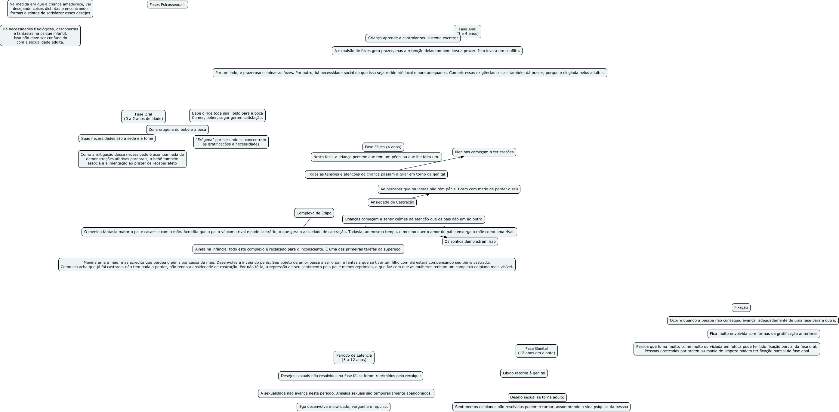Esse mapa conceitual, produzido no IHMC CmapTools, tem a informação relacionada a: Freud - Fases Psicossexuais, Todas as tensões e atenções da criança passam a girar em torno da genital Meninos começam a ter ereções, Complexo de édipo e complexo de Eléctra Os sonhos demonstram isso, Complexo de Édipo O menino fantasia matar o pai e casar-se com a mãe. Acredita que o pai o vê como rival e pode castrá-lo, o que gera a ansiedade de castração. Todavia, ao mesmo tempo, o menino quer o amor do pai e enxerga a mãe como uma rival., O menino fantasia matar o pai e casar-se com a mãe. Acredita que o pai o vê como rival e pode castrá-lo, o que gera a ansiedade de castração. Todavia, ao mesmo tempo, o menino quer o amor do pai e enxerga a mãe como uma rival. Ainda na infância, todo este complexo é recalcado para o inconsciente. É uma das primeiras tarefas do superego., Ansiedade de Castração Ao perceber que mulheres não têm pênis, ficam com medo de perder o seu