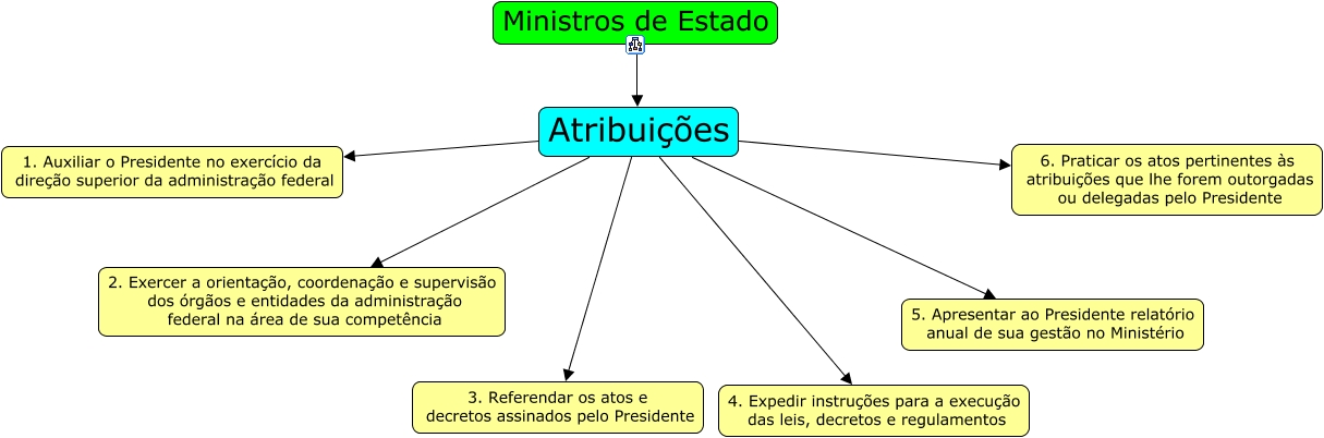 Esse mapa conceitual, produzido no IHMC CmapTools, tem a informação relacionada a: PE - Ministros - Atribuições, Atribuições 5. Apresentar ao Presidente relatório anual de sua gestão no Ministério, Atribuições 4. Expedir instruções para a execução das leis, decretos e regulamentos, Atribuições 2. Exercer a orientação, coordenação e supervisão dos órgãos e entidades da administração federal na área de sua competência, Ministros de Estado Atribuições, Atribuições 3. Referendar os atos e decretos assinados pelo Presidente, Atribuições 1. Auxiliar o Presidente no exercício da direção superior da administração federal, Atribuições 6. Praticar os atos pertinentes às atribuições que lhe forem outorgadas ou delegadas pelo Presidente