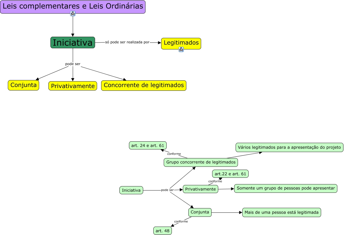 Esse mapa conceitual, produzido no IHMC CmapTools, tem a informação relacionada a: Projeto de Lei Complementar ou Ordinária - Iniciativa, Conjunta Mais de uma pessoa está legitimada, Privativamente conforme art.22 e art. 61, Iniciativa só pode ser realizada por Legitimados, Iniciativa pode ser Grupo concorrente de legitimados, Iniciativa pode ser Concorrente de legitimados, Iniciativa pode ser Conjunta, Grupo concorrente de legitimados conforme art. 24 e art. 61, Grupo concorrente de legitimados Vários legitimados para a apresentação do projeto, Conjunta conforme art. 48, Leis complementares e Leis Ordinárias Iniciativa, Privativamente Somente um grupo de pessoas pode apresentar, Iniciativa pode ser Privativamente, Iniciativa pode ser Conjunta, Iniciativa pode ser Privativamente