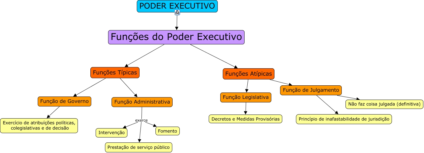 Esse mapa conceitual, produzido no IHMC CmapTools, tem a informação relacionada a: Poder Executivo - Funções, Função Administrativa exerce Intervenção, Função de Julgamento Não faz coisa julgada (definitiva), Funções Atípicas Função Legislativa, Função Administrativa exerce Fomento, Função Legislativa Decretos e Medidas Provisórias, Função de Governo Exercício de atribuíções políticas, colegislativas e de decisão, Funções do Poder Executivo Funções Típicas, PODER EXECUTIVO Funções do Poder Executivo, Função de Julgamento Princípio de inafastabilidade de jurisdição, Funções Típicas Função Administrativa, Funções Atípicas Função de Julgamento, Funções Típicas Função de Governo, Funções do Poder Executivo Funções Atípicas, Função Administrativa exerce Prestação de serviço público