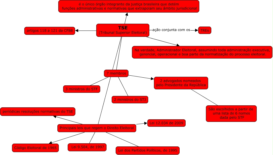 Esse mapa conceitual, produzido no IHMC CmapTools, tem a informação relacionada a: TSE, Principais leis que regem o Direito Eleitoral Código Eleitoral de 1965, TSE (Tribunal Superior Eleitoral) Principais leis que regem o Direito Eleitoral, TSE (Tribunal Superior Eleitoral) 7 membros, TSE (Tribunal Superior Eleitoral) Na verdade, Administrador Eleitoral, assumindo toda administração executiva, gerencial, operacional e boa parte da normatização do processo eleitoral., 7 membros 3 ministros do STF, Principais leis que regem o Direito Eleitoral Lei 9.504, de 1997, TSE (Tribunal Superior Eleitoral) artigos 118 a 121 da CF88, 7 membros 2 advogados nomeados pelo Presidente da República, TSE (Tribunal Superior Eleitoral) ação conjunta com os TREs, 2 advogados nomeados pelo Presidente da República São escolhidos a partir de uma lista de 6 nomes dada pelo STF, Principais leis que regem o Direito Eleitoral Lei 12.034 de 2009, 7 membros 2 ministros do STJ, TSE (Tribunal Superior Eleitoral) é o único órgão integrante da justiça brasileira que detém funções administrativas e normativas que extrapolam seu âmbito jurisdicional, Principais leis que regem o Direito Eleitoral Lei dos Partidos Políticos, de 1995, Principais leis que regem o Direito Eleitoral periódicas resoluções normativas do TSE