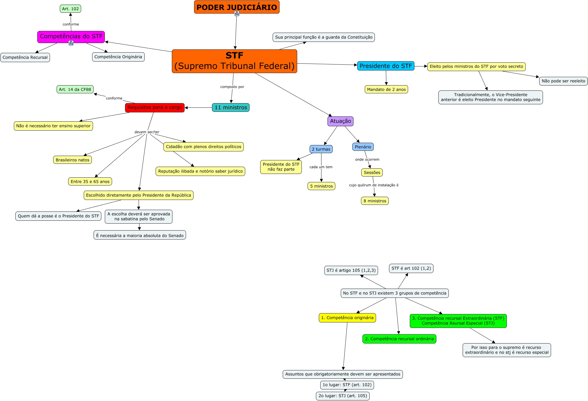 Esse mapa conceitual, produzido no IHMC CmapTools, tem a informação relacionada a: STF, Escolhido diretamente pelo Presidente da República Quem dá a posse é o Presidente do STF, No STF e no STJ existem 3 grupos de competência 1. Competência originária, 1o lugar: STF (art. 102) 2o lugar: STJ (art. 105), No STF e no STJ existem 3 grupos de competência 3. Competência recursal Extraordinária (STF) Competência Reursal Especial (STJ), Competências do STF Competência Originária, Assuntos que obrigatoriamente devem ser apresentados 1o lugar: STF (art. 102), 2 turmas Presidente do STF não faz parte, Plenário onde ocorrem Sessões, Escolhido diretamente pelo Presidente da República A escolha deverá ser aprovada na sabatina pelo Senado, STF (Supremo Tribunal Federal) composto por 11 ministros, Eleito pelos ministros do STF por voto secreto Tradicionalmente, o Vice-Presidente anterior é eleito Presidente no mandato seguinte, Requisitos para o cargo Não é necessário ter ensino superior, Presidente do STF Mandato de 2 anos, No STF e no STJ existem 3 grupos de competência STJ é artigo 105 (1,2,3), A escolha deverá ser aprovada na sabatina pelo Senado É necessária a maioria absoluta do Senado, STF (Supremo Tribunal Federal) Sua principal função é a guarda da Constituição, 1. Competência originária Assuntos que obrigatoriamente devem ser apresentados, No STF e no STJ existem 3 grupos de competência 2. Competência recursal ordinária, Requisitos para o cargo devem ser/ter Cidadão com plenos direitos políticos, Competências do STF Competência Recursal