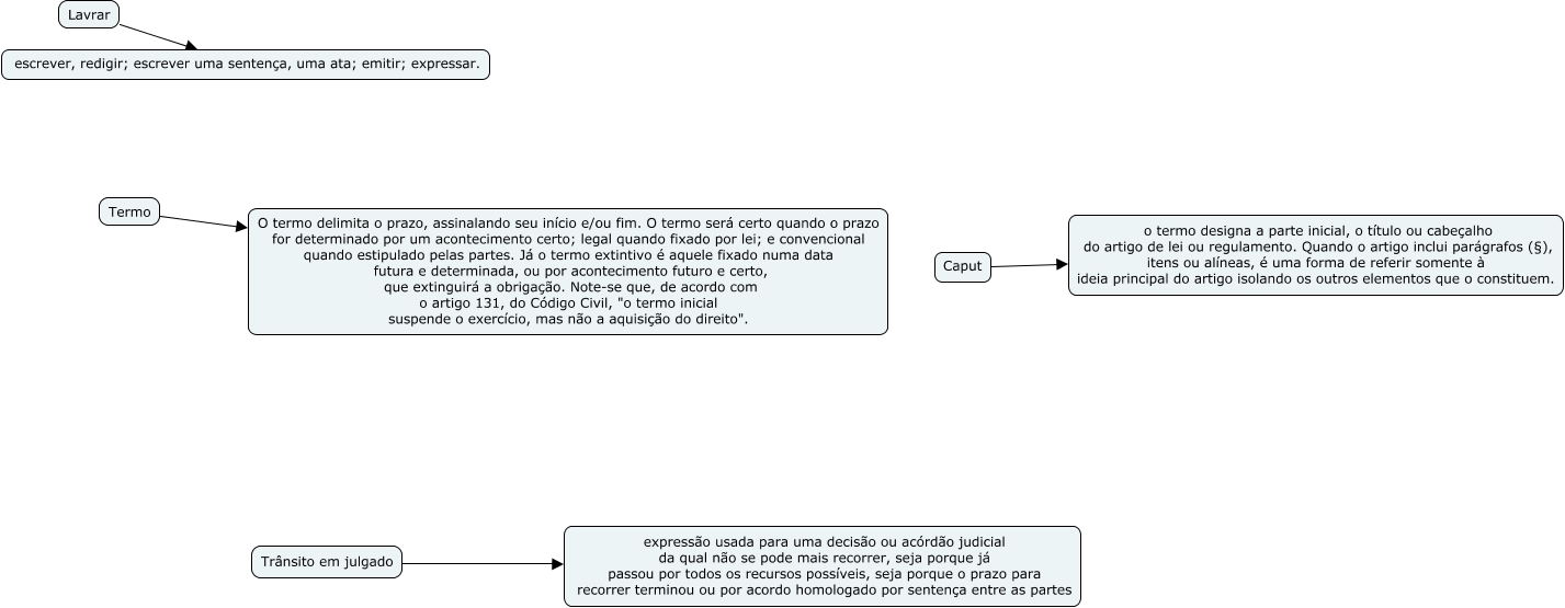 Esse mapa conceitual, produzido no IHMC CmapTools, tem a informação relacionada a: TERMOS TÉCNICOS, Trânsito em julgado expressão usada para uma decisão ou acórdão judicial da qual não se pode mais recorrer, seja porque já passou por todos os recursos possíveis, seja porque o prazo para recorrer terminou ou por acordo homologado por sentença entre as partes, Caput o termo designa a parte inicial, o título ou cabeçalho do artigo de lei ou regulamento. Quando o artigo inclui parágrafos (§), itens ou alíneas, é uma forma de referir somente à ideia principal do artigo isolando os outros elementos que o constituem., Lavrar escrever, redigir; escrever uma sentença, uma ata; emitir; expressar., Termo O termo delimita o prazo, assinalando seu início e/ou fim. O termo será certo quando o prazo for determinado por um acontecimento certo; legal quando fixado por lei; e convencional quando estipulado pelas partes. Já o termo extintivo é aquele fixado numa data futura e determinada, ou por acontecimento futuro e certo, que extinguirá a obrigação. Note-se que, de acordo com o artigo 131, do Código Civil, "o termo inicial suspende o exercício, mas não a aquisição do direito".