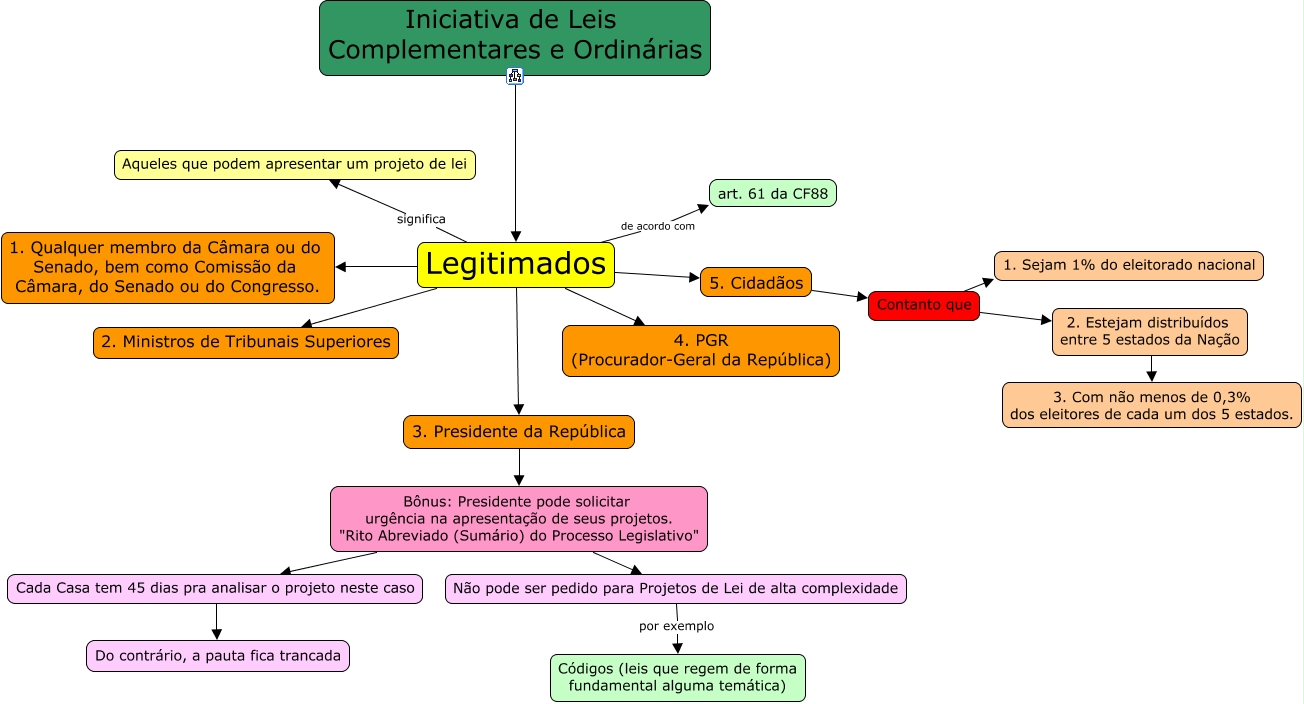 Esse mapa conceitual, produzido no IHMC CmapTools, tem a informação relacionada a: Leis Complementares e Ordinárias - Legitimados, Legitimados 2. Ministros de Tribunais Superiores, Legitimados 3. Presidente da República, Contanto que 2. Estejam distribuídos entre 5 estados da Nação, 2. Estejam distribuídos entre 5 estados da Nação 3. Com não menos de 0,3% dos eleitores de cada um dos 5 estados., Legitimados 4. PGR (Procurador-Geral da República), Iniciativa de Leis Complementares e Ordinárias Legitimados, Legitimados significa Aqueles que podem apresentar um projeto de lei, Legitimados 5. Cidadãos, 5. Cidadãos Contanto que, Não pode ser pedido para Projetos de Lei de alta complexidade por exemplo Códigos (leis que regem de forma fundamental alguma temática), Bônus: Presidente pode solicitar urgência na apresentação de seus projetos. "Rito Abreviado (Sumário) do Processo Legislativo" Não pode ser pedido para Projetos de Lei de alta complexidade, Legitimados de acordo com art. 61 da CF88, Legitimados 1. Qualquer membro da Câmara ou do Senado, bem como Comissão da Câmara, do Senado ou do Congresso., Cada Casa tem 45 dias pra analisar o projeto neste caso Do contrário, a pauta fica trancada, Bônus: Presidente pode solicitar urgência na apresentação de seus projetos. "Rito Abreviado (Sumário) do Processo Legislativo" Cada Casa tem 45 dias pra analisar o projeto neste caso, Contanto que 1. Sejam 1% do eleitorado nacional, 3. Presidente da República Bônus: Presidente pode solicitar urgência na apresentação de seus projetos. "Rito Abreviado (Sumário) do Processo Legislativo"