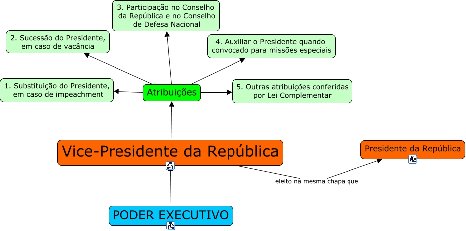 Esse mapa conceitual, produzido no IHMC CmapTools, tem a informação relacionada a: Poder Executivo - Vice-Presidência da República, Vice-Presidente da República Atribuições, PODER EXECUTIVO Vice-Presidente da República, Atribuições 2. Sucessão do Presidente, em caso de vacância, Atribuições 1. Substituição do Presidente, em caso de impeachment, Atribuições 5. Outras atribuições conferidas por Lei Complementar, Atribuições 4. Auxiliar o Presidente quando convocado para missões especiais, Vice-Presidente da República eleito na mesma chapa que Presidente da República, Atribuições 3. Participação no Conselho da República e no Conselho de Defesa Nacional