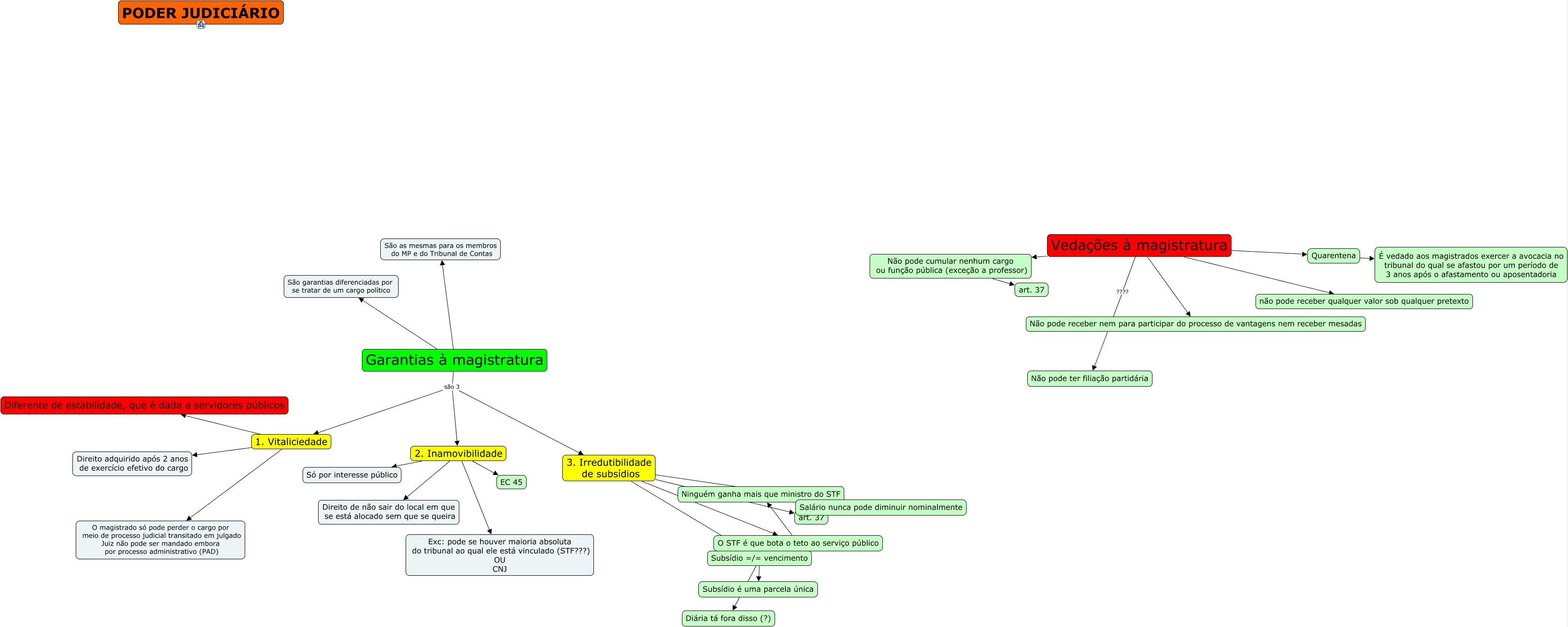 Esse mapa conceitual, produzido no IHMC CmapTools, tem a informação relacionada a: Vedações e Garantias a magistrados, Vedações à magistratura Não pode cumular nenhum cargo ou função pública (exceção a professor), 3. Irredutibilidade de subsídios Subsídio =/= vencimento, Garantias à magistratura São as mesmas para os membros do MP e do Tribunal de Contas, Vedações à magistratura ???? Não pode ter filiação partidária, Vedações à magistratura Não pode receber nem para participar do processo de vantagens nem receber mesadas, Não pode cumular nenhum cargo ou função pública (exceção a professor) art. 37, Garantias à magistratura são 3 2. Inamovibilidade, O STF é que bota o teto ao serviço público Ninguém ganha mais que ministro do STF, Garantias à magistratura São garantias diferenciadas por se tratar de um cargo político, 3. Irredutibilidade de subsídios art. 37, 1. Vitaliciedade Direito adquirido após 2 anos de exercício efetivo do cargo, Quarentena É vedado aos magistrados exercer a avocacia no tribunal do qual se afastou por um período de 3 anos após o afastamento ou aposentadoria, Subsídio =/= vencimento Diária tá fora disso (?), Subsídio =/= vencimento Subsídio é uma parcela única, Vedações à magistratura não pode receber qualquer valor sob qualquer pretexto, 3. Irredutibilidade de subsídios O STF é que bota o teto ao serviço público, 1. Vitaliciedade Diferente de estabilidade, que é dada a servidores públicos, Garantias à magistratura são 3 1. Vitaliciedade, 2. Inamovibilidade EC 45, Garantias à magistratura são 3 3. Irredutibilidade de subsídios