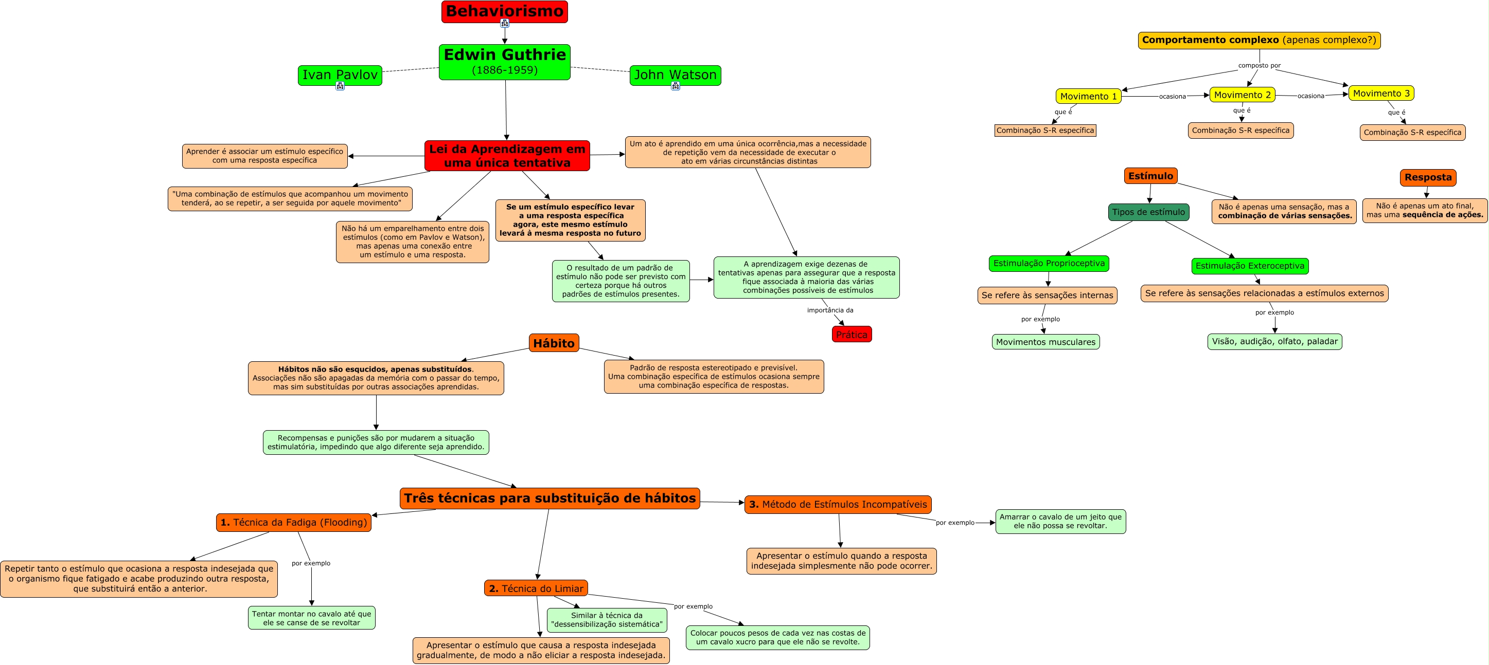 Esse mapa conceitual, produzido no IHMC CmapTools, tem a informação relacionada a: Edwin Guthrie, Se um estímulo específico levar a uma resposta específica agora, este mesmo estímulo levará à mesma resposta no futuro O resultado de um padrão de estímulo não pode ser previsto com certeza porque há outros padrões de estímulos presentes., O resultado de um padrão de estímulo não pode ser previsto com certeza porque há outros padrões de estímulos presentes. A aprendizagem exige dezenas de tentativas apenas para assegurar que a resposta fique associada à maioria das várias combinações possíveis de estímulos, Se refere às sensações internas por exemplo Movimentos musculares, 2. Técnica do Limiar por exemplo Colocar poucos pesos de cada vez nas costas de um cavalo xucro para que ele não se revolte., Movimento 2 que é Combinação S-R específica, 2. Técnica do Limiar Apresentar o estímulo que causa a resposta indesejada gradualmente, de modo a não eliciar a resposta indesejada., Hábito Padrão de resposta estereotipado e previsível. Uma combinação específica de estímulos ocasiona sempre uma combinação específica de respostas., Resposta Não é apenas um ato final, mas uma sequência de ações., Comportamento complexo (apenas complexo?) composto por Movimento 1, Movimento 2 ocasiona Movimento 3, Behaviorismo Edwin Guthrie (1886-1959), A aprendizagem exige dezenas de tentativas apenas para assegurar que a resposta fique associada à maioria das várias combinações possíveis de estímulos importância da Prática, Lei da Aprendizagem em uma única tentativa Não há um emparelhamento entre dois estímulos (como em Pavlov e Watson), mas apenas uma conexão entre um estímulo e uma resposta., Ivan Pavlov Edwin Guthrie (1886-1959), Três técnicas para substituição de hábitos 3. Método de Estímulos Incompatíveis, 1. Técnica da Fadiga (Flooding) Repetir tanto o estímulo que ocasiona a resposta indesejada que o organismo fique fatigado e acabe produzindo outra resposta, que substituirá então a anterior., Estimulação Exteroceptiva Se refere às sensações relacionadas a estímulos externos, Lei da Aprendizagem em uma única tentativa Se um estímulo específico levar a uma resposta específica agora, este mesmo estímulo levará à mesma resposta no futuro, Três técnicas para substituição de hábitos 2. Técnica do Limiar, Comportamento complexo (apenas complexo?) composto por Movimento 2