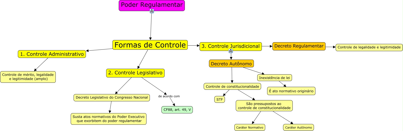 Esse mapa conceitual, produzido no IHMC CmapTools, tem a informação relacionada a: PE - Poder Regulamentar - Formas de Controle, 3. Controle Jurisdicional Decreto Regulamentar, Controle de constitucionalidade São pressupostos ao controle de constitucionalidade, Inexistência de lei É ato normativo originário, Formas de Controle 3. Controle Jurisdicional, Controle de constitucionalidade STF, 2. Controle Legislativo Decreto Legislativo do Congresso Nacional, Decreto Autônomo Inexistência de lei, São pressupostos ao controle de constitucionalidade Caráter Normativo, Decreto Autônomo Controle de constitucionalidade, Formas de Controle 1. Controle Administrativo, Decreto Regulamentar Controle de legalidade e legitimidade, Poder Regulamentar Formas de Controle, Formas de Controle 2. Controle Legislativo, 1. Controle Administrativo Controle de mérito, legalidade e legitimidade (amplo), 2. Controle Legislativo de acordo com CF88, art. 49, V, São pressupostos ao controle de constitucionalidade Caráter Autônomo, 3. Controle Jurisdicional Decreto Autônomo, Decreto Legislativo do Congresso Nacional Susta atos normativos do Poder Executivo que exorbitem do poder regulamentar