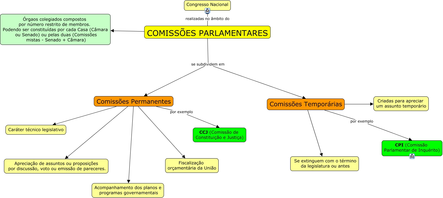 Esse mapa conceitual, produzido no IHMC CmapTools, tem a informação relacionada a: COMISSÕES PARLAMENTARES, Comissões Permanentes Fiscalização orçamentária da União, Comissões Temporárias Criadas para apreciar um assunto temporário, COMISSÕES PARLAMENTARES são Órgaos colegiados compostos por número restrito de membros. Podendo ser constituídas por cada Casa (Câmara ou Senado) ou pelas duas (Comissões mistas - Senado + Câmara), Comissões Permanentes Apreciação de assuntos ou proposições por discussão, voto ou emissão de pareceres., Comissões Permanentes Caráter técnico legislativo, COMISSÕES PARLAMENTARES realizadas no âmbito do Congresso Nacional, COMISSÕES PARLAMENTARES se subdividem em Comissões Temporárias, COMISSÕES PARLAMENTARES se subdividem em Comissões Permanentes, Comissões Temporárias Se extinguem com o término da legislatura ou antes, Comissões Permanentes por exemplo CCJ (Comissão de Constituição e Justiça), Comissões Permanentes Acompanhamento dos planos e programas governamentais, Comissões Temporárias por exemplo CPI (Comissão Parlamentar de Inquérito)