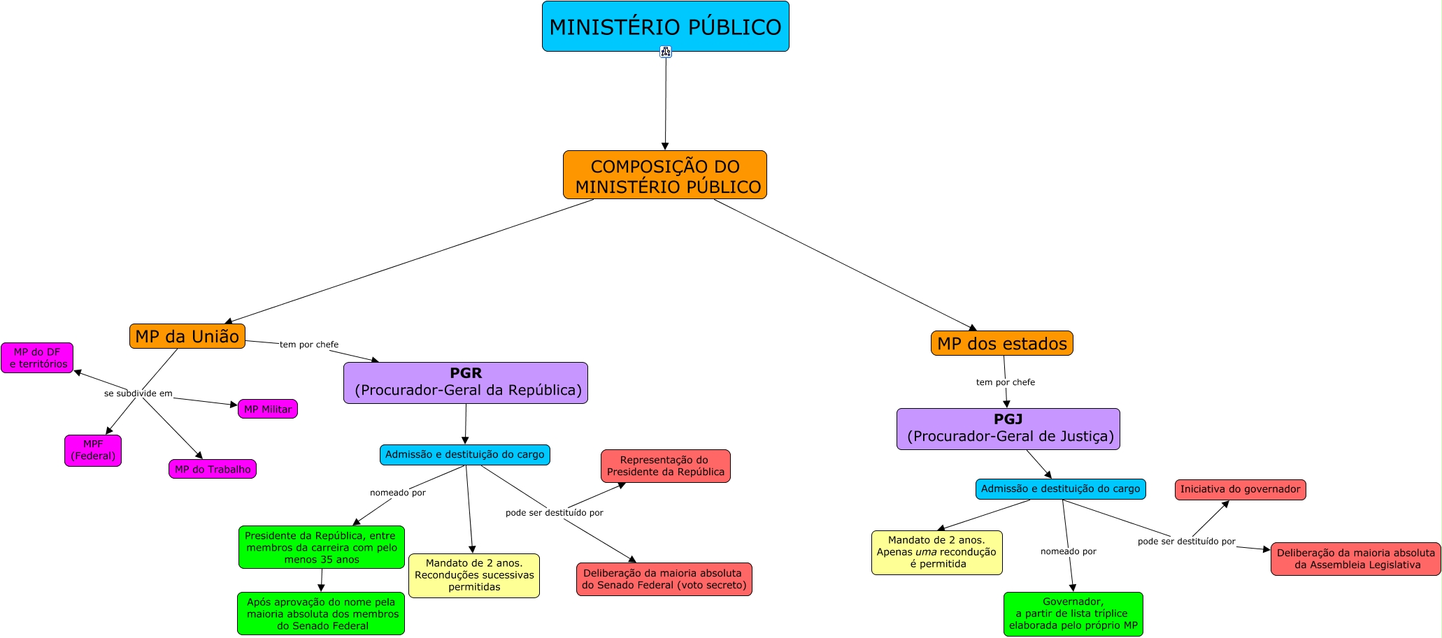 Esse mapa conceitual, produzido no IHMC CmapTools, tem a informação relacionada a: MP - COMPOSIÇÃO DO MP, COMPOSIÇÃO DO MINISTÉRIO PÚBLICO MP dos estados, Admissão e destituição do cargo nomeado por Presidente da República, entre membros da carreira com pelo menos 35 anos, MP da União se subdivide em MP do DF e territórios, Admissão e destituição do cargo pode ser destituído por Deliberação da maioria absoluta da Assembleia Legislativa, MP da União tem por chefe PGR (Procurador-Geral da República), Admissão e destituição do cargo pode ser destituído por Deliberação da maioria absoluta do Senado Federal (voto secreto), Presidente da República, entre membros da carreira com pelo menos 35 anos Após aprovação do nome pela maioria absoluta dos membros do Senado Federal, Admissão e destituição do cargo Mandato de 2 anos. Reconduções sucessivas permitidas, MP da União se subdivide em MPF (Federal), Admissão e destituição do cargo pode ser destituído por Iniciativa do governador, MP da União se subdivide em MP do Trabalho, PGJ (Procurador-Geral de Justiça) Admissão e destituição do cargo, Admissão e destituição do cargo Mandato de 2 anos. Apenas umarecondução é permitida, PGR (Procurador-Geral da República) Admissão e destituição do cargo, COMPOSIÇÃO DO MINISTÉRIO PÚBLICO MP da União, MP da União se subdivide em MP Militar, Admissão e destituição do cargo pode ser destituído por Representação do Presidente da República, MP dos estados tem por chefe PGJ (Procurador-Geral de Justiça), Admissão e destituição do cargo nomeado por Governador, a partir de lista tríplice elaborada pelo próprio MP, MINISTÉRIO PÚBLICO COMPOSIÇÃO DO MINISTÉRIO PÚBLICO