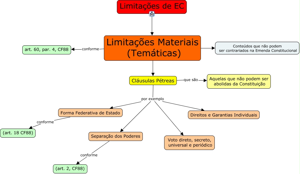 Esse mapa conceitual, produzido no IHMC CmapTools, tem a informação relacionada a: PL - Atos Normativos Primários - EC - Limitações Materiais, Cláusulas Pétreas por exemplo Direitos e Garantias Individuais, Limitações de EC Limitações Materiais (Temáticas), Forma Federativa de Estado conforme (art. 18 CF88), Cláusulas Pétreas por exemplo Separação dos Poderes, Cláusulas Pétreas por exemplo Voto direto, secreto, universal e periódico, Limitações Materiais (Temáticas) Conteúdos que não podem ser contrariados na Emenda Constitucional, Limitações Materiais (Temáticas) conforme art. 60, par. 4, CF88, Limitações Materiais (Temáticas) Cláusulas Pétreas, Cláusulas Pétreas que são Aquelas que não podem ser abolidas da Constituição, Cláusulas Pétreas por exemplo Forma Federativa de Estado, Separação dos Poderes conforme (art. 2, CF88)