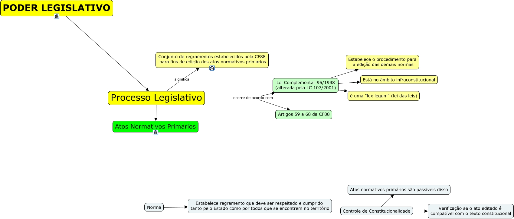Esse mapa conceitual, produzido no IHMC CmapTools, tem a informação relacionada a: PROCESSO LEGISLATIVO, Processo Legislativo significa Conjunto de regramentos estabelecidos pela CF88 para fins de edição dos atos normativos primarios, Lei Complementar 95/1998 (alterada pela LC 107/2001) Estabelece o procedimento para a edição das demais normas, Lei Complementar 95/1998 (alterada pela LC 107/2001) Está no âmbito infraconstitucional, Controle de Constitucionalidade Verificação se o ato editado é compatível com o texto constitucional, Lei Complementar 95/1998 (alterada pela LC 107/2001) é uma "lex legum" (lei das leis), PODER LEGISLATIVO Processo Legislativo, Processo Legislativo Atos Normativos Primários, Norma Estabelece regramento que deve ser respeitado e cumprido tanto pelo Estado como por todos que se encontrem no território, Processo Legislativo ocorre de acordo com Artigos 59 a 68 da CF88, Processo Legislativo ocorre de acordo com Lei Complementar 95/1998 (alterada pela LC 107/2001), Controle de Constitucionalidade Atos normativos primários são passíveis disso