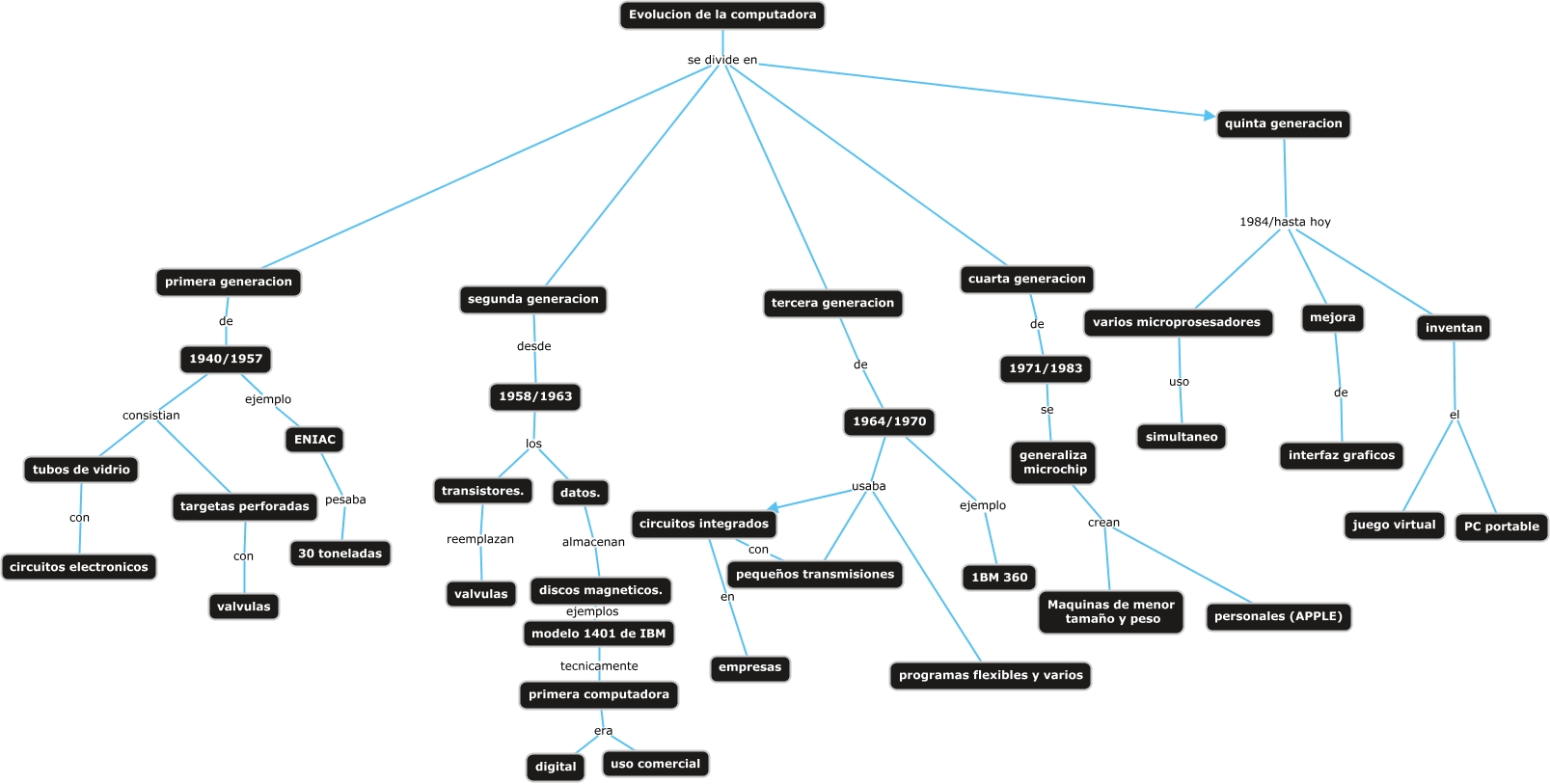 Este Cmap, tiene información relacionada con: evolucion de las computadoras, 1964/1970 usaba programas flexibles y varios, primera generacion de 1940/1957, modelo 1401 de IBM tecnicamente primera computadora, inventan el juego virtual, cuarta generacion de 1971/1983, primera computadora era uso comercial, 1958/1963 los datos., inventan el PC portable, 1940/1957 ejemplo ENIAC, quinta generacion 1984/hasta hoy varios microprosesadores, circuitos integrados con pequeños transmisiones, generaliza microchip crean Maquinas de menor tamaño y peso, 1940/1957 consistian targetas perforadas, Evolucion de la computadora se divide en tercera generacion, generaliza microchip crean personales (APPLE), discos magneticos. ejemplos modelo 1401 de IBM, circuitos integrados en empresas, Evolucion de la computadora se divide en segunda generacion, varios microprosesadores uso simultaneo, Evolucion de la computadora se divide en quinta generacion