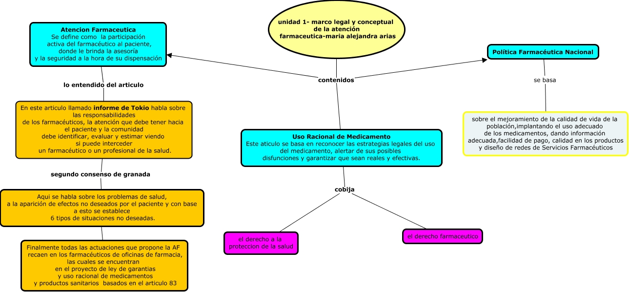 Este Cmap, tiene información relacionada con: marco legal y conceptual, En este articulo llamado informe de Tokio habla sobre las responsabilidades de los farmacéuticos, la atención que debe tener hacia el paciente y la comunidad debe identificar, evaluar y estimar viendo si puede interceder un farmacéutico o un profesional de la salud. segundo consenso de granada Aqui se habla sobre los problemas de salud, a la aparición de efectos no deseados por el paciente y con base a esto se establece 6 tipos de situaciones no deseadas., Aqui se habla sobre los problemas de salud, a la aparición de efectos no deseados por el paciente y con base a esto se establece 6 tipos de situaciones no deseadas. ???? Finalmente todas las actuaciones que propone la AF recaen en los farmacéuticos de oficinas de farmacia, las cuales se encuentran en el proyecto de ley de garantias y uso racional de medicamentos y productos sanitarios basados en el articulo 83, Política Farmacéutica Nacional se basa sobre el mejoramiento de la calidad de vida de la población,implantando el uso adecuado de los medicamentos, dando información adecuada,facilidad de pago, calidad en los productos y diseño de redes de Servicios Farmacéuticos, Uso Racional de Medicamento Este aticulo se basa en reconocer las estrategias legales del uso del medicamento, alertar de sus posibles disfunciones y garantizar que sean reales y efectivas. cobija el derecho a la proteccion de la salud, unidad 1- marco legal y conceptual de la atención farmaceutica-maria alejandra arias contenidos Uso Racional de Medicamento Este aticulo se basa en reconocer las estrategias legales del uso del medicamento, alertar de sus posibles disfunciones y garantizar que sean reales y efectivas., Uso Racional de Medicamento Este aticulo se basa en reconocer las estrategias legales del uso del medicamento, alertar de sus posibles disfunciones y garantizar que sean reales y efectivas. cobija el derecho farmaceutico, unidad 1- marco legal y conceptual de la atención farmaceutica-maria alejandra arias contenidos Política Farmacéutica Nacional, Atencion Farmaceutica Se define como la participación activa del farmacéutico al paciente, donde le brinda la asesoría y la seguridad a la hora de su dispensación lo entendido del articulo En este articulo llamado informe de Tokio habla sobre las responsabilidades de los farmacéuticos, la atención que debe tener hacia el paciente y la comunidad debe identificar, evaluar y estimar viendo si puede interceder un farmacéutico o un profesional de la salud., unidad 1- marco legal y conceptual de la atención farmaceutica-maria alejandra arias contenidos Atencion Farmaceutica Se define como la participación activa del farmacéutico al paciente, donde le brinda la asesoría y la seguridad a la hora de su dispensación
