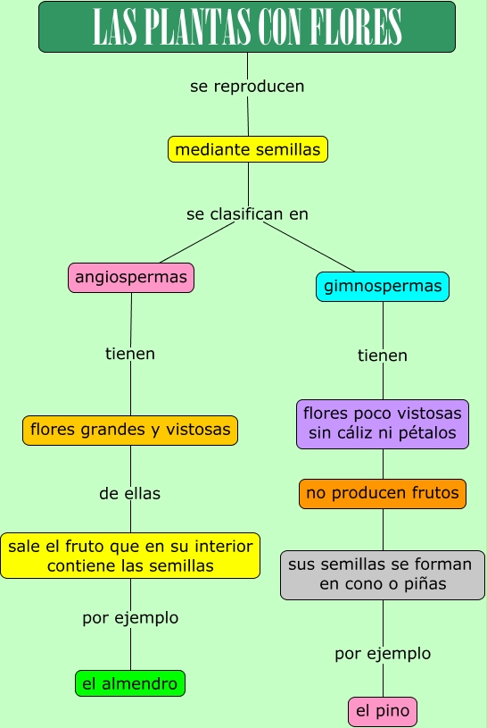 Este Cmap, tiene información relacionada con: Las plantas con flores, sus semillas se forman en cono o piñas por ejemplo el pino, gimnospermas tienen flores poco vistosas sin cáliz ni pétalos, flores grandes y vistosas de ellas sale el fruto que en su interior contiene las semillas, LAS PLANTAS CON FLORES se reproducen mediante semillas, mediante semillas se clasifican en gimnospermas, flores poco vistosas sin cáliz ni pétalos no producen frutos, no producen frutos sus semillas se forman en cono o piñas, angiospermas tienen flores grandes y vistosas, mediante semillas se clasifican en angiospermas, sale el fruto que en su interior contiene las semillas por ejemplo el almendro