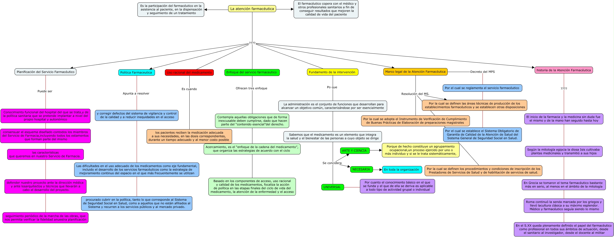 Este Cmap, tiene información relacionada con: servicio farmaceutico, historia de la Atención Farmacéutica ???? En Grecia se tomaron el tema farmacéutico bastante más en serio, al menos en el ámbito de la mitología, La atención farmacéutica ???? Uso racional del medicamento, Planificación del Servicio Farmacéutico Puede ser consensuar el esquema diseñado contodos los miembros del Servicio de Farmacia,incluyendo todos los estamentos que forman parte del mismo, La atención farmacéutica ???? El farmacéutico copera con el médico y otros profesionales sanitarios a fin de conseguir resultados que mejoren la calidad de vida del paciente, La atención farmacéutica ???? Politica Farmaceutica, Marco legal de la Atención Farmacéutica Decreto del MPS Por el cual se reglamenta el servicio farmacéutico, Fundamento de la intervención Po que Sabemos que el medicamento es un elemento que integra la salud y el bienestar de las personas a cuyo objeto se dirige, Politica Farmaceutica Apunta a resolver Las dificultades en el uso adecuado de los medicamentos como eje fundamental, incluido el desarrollo de los servicios farmacéuticos como la estrategia de mejoramiento continuo del espacio en el que más frecuentemente se utilizan, La atención farmacéutica ???? Es la participación del farmacéutico en la asistencia al paciente, en la dispensación y seguimiento de un tratamiento, La atención farmacéutica ???? Fundamento de la intervención, UNIVERSAL ???? Por cuanto el conocimiento básico en el que se funda y el que de ella se deriva es aplicable a todo tipo de actividad grupal o individual, historia de la Atención Farmacéutica ???? Roma continuó la senda marcada por los griegos y llevó lacultura clásica a su máximo esplendor. Médico y farmacéutico seguía siendo lo mismo, La atención farmacéutica ???? Enfoque del servicio farmaceutico, Planificación del Servicio Farmacéutico Puede ser las características que queremos en nuestro Servicio de Farmacia., Politica Farmaceutica Apunta a resolver y corregir defectos del sistema de vigilancia y control de la calidad y a reducir inequidades en el acceso, La atención farmacéutica ???? Planificación del Servicio Farmacéutico, Marco legal de la Atención Farmacéutica Decreto del MPS Por el cual se establece el Sistema Obligatorio de Garantía de Calidad de la Atención de Salud del Sistema General de Seguridad Social en Salud., NECESARIA ???? En toda la organización, Marco legal de la Atención Farmacéutica Resolución del MS. Por la cual se definen los procedimientos y condiciones de inscripción de los Prestadores de Servicios de Salud y de habilitación de servicios de salud., Enfoque del servicio farmaceutico Ofrecen tres enfoque Acercamiento, es el “enfoque de la cadena del medicamento”, que organiza las estrategias de acuerdo con el ciclo