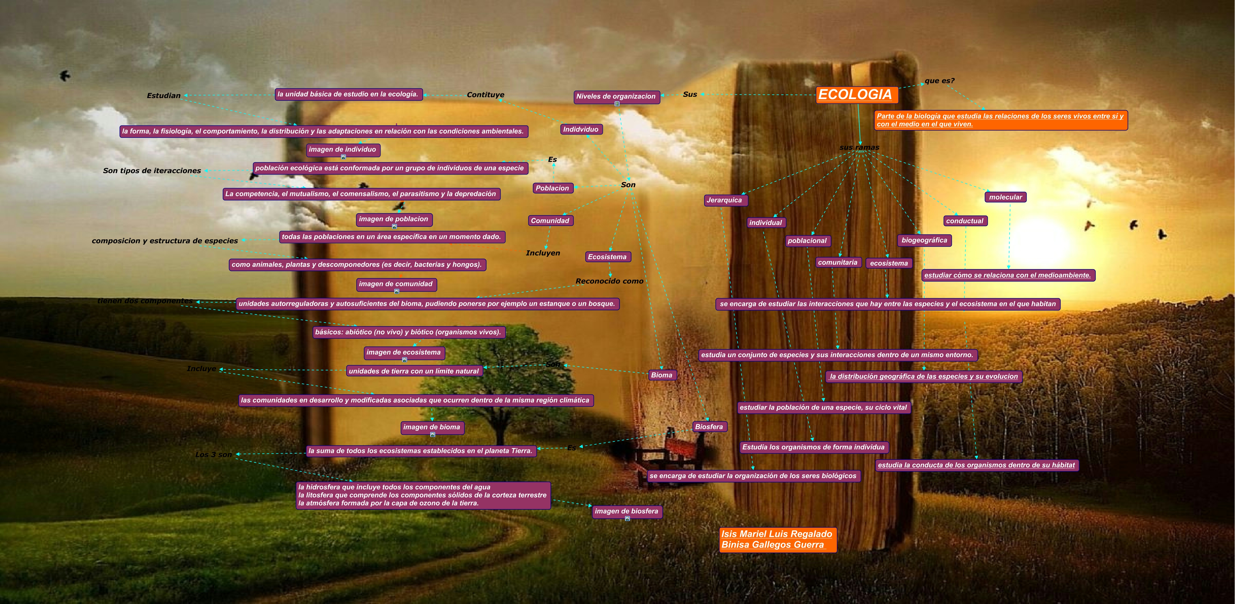 Este Cmap, tiene información relacionada con: trabajo de mariel y binisa, unidades autorreguladoras y autosuficientes del bioma, pudiendo ponerse por ejemplo un estanque o un bosque. tienen dos componentes básicos: abiótico (no vivo) y biótico (organismos vivos)., la unidad básica de estudio en la ecología. Estudian la forma, la fisiología, el comportamiento, la distribución y las adaptaciones en relación con las condiciones ambientales., poblacional estudiar la población de una especie, su ciclo vital, población ecológica está conformada por un grupo de individuos de una especie Son tipos de iteracciones La competencia, el mutualismo, el comensalismo, el parasitismo y la depredación, Poblacion Es población ecológica está conformada por un grupo de individuos de una especie, Niveles de organizacion Son Comunidad, ECOLOGIA sus ramas molecular, Niveles de organizacion Son Bioma, unidades de tierra con un límite natural Incluye las comunidades en desarrollo y modificadas asociadas que ocurren dentro de la misma región climática, ECOLOGIA sus ramas comunitaria, básicos: abiótico (no vivo) y biótico (organismos vivos). imagen de ecosistema, Niveles de organizacion Son Ecosistema, todas las poblaciones en un área específica en un momento dado. composicion y estructura de especies como animales, plantas y descomponedores (es decir, bacterias y hongos)., biogeográfica la distribución geográfica de las especies y su evolucion, Niveles de organizacion Son Indidviduo, La competencia, el mutualismo, el comensalismo, el parasitismo y la depredación imagen de poblacion, ECOLOGIA sus ramas Jerarquica, Comunidad Incluyen todas las poblaciones en un área específica en un momento dado., como animales, plantas y descomponedores (es decir, bacterias y hongos). imagen de comunidad, ECOLOGIA sus ramas individual