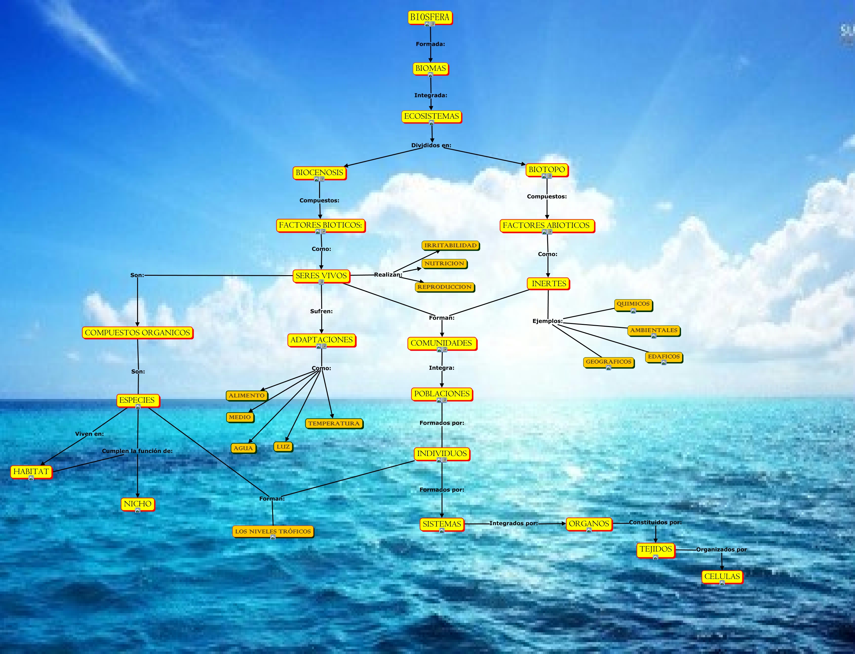 Este Cmap, tiene información relacionada con: MAPA, FACTORES ABIOTICOS Como: INERTES, BIOMAS Integrada: ECOSISTEMAS, TEJIDOS Organizados por CELULAS, ESPECIES Cumplen la función de: HABITAT, SERES VIVOS Realizan: REPRODUCCION, ESPECIES Forman: INDIVIDUOS, ADAPTACIONES Como: TEMPERATURA, SERES VIVOS Realizan: NUTRICION, ADAPTACIONES Como: MEDIO, BIOSFERA Formada: BIOMAS, ADAPTACIONES Como: AGUA, INERTES Ejemplos: GEOGRAFICOS, BIOCENOSIS Compuestos: FACTORES BIOTICOS:, INERTES Ejemplos: AMBIENTALES, FACTORES BIOTICOS: Como: SERES VIVOS, COMPUESTOS ORGANICOS Son: ESPECIES, SISTEMAS Integrados por: ORGANOS, ORGANOS Constituidos por: TEJIDOS, POBLACIONES Formados por: INDIVIDUOS, ADAPTACIONES Como: ALIMENTO