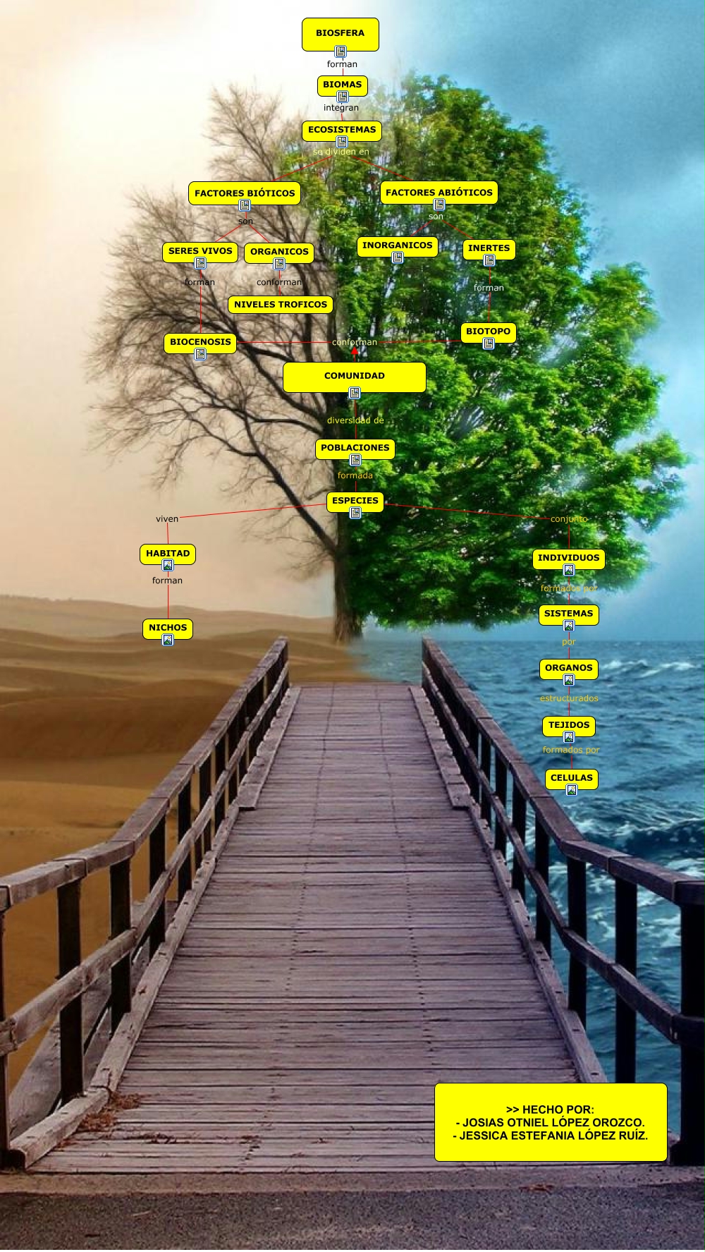 Este Cmap, tiene información relacionada con: BIOSFERA, INERTES forman BIOTOPO, HABITAD forman NICHOS, ECOSISTEMAS se dividen en FACTORES ABIÓTICOS, BIOCENOSIS conforman BIOTOPO, ECOSISTEMAS se dividen en FACTORES BIÓTICOS, FACTORES BIÓTICOS son ORGANICOS, ESPECIES conjunto INDIVIDUOS, COMUNIDAD conforman BIOTOPO, INDIVIDUOS formados por SISTEMAS, FACTORES ABIÓTICOS son INORGANICOS, COMUNIDAD diversidad de POBLACIONES, FACTORES BIÓTICOS son SERES VIVOS, ORGANICOS conforman NIVELES TROFICOS, ESPECIES viven HABITAD, BIOSFERA forman BIOMAS, SISTEMAS por ORGANOS, POBLACIONES formada ESPECIES, FACTORES ABIÓTICOS son INERTES, BIOMAS integran ECOSISTEMAS, SERES VIVOS forman BIOCENOSIS