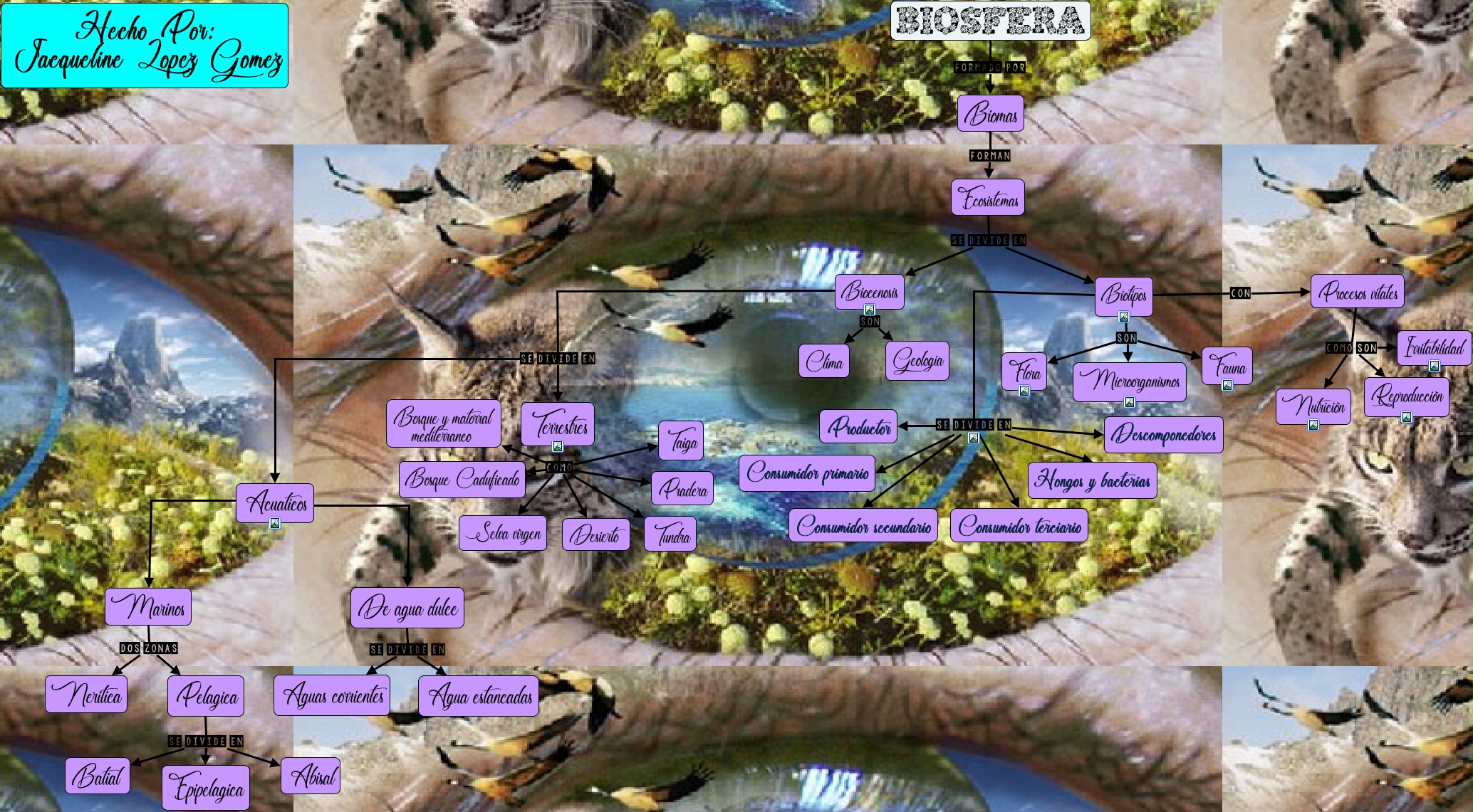 Este Cmap, tiene información relacionada con: Jaqueline, Biosfera Formado por Biomas, Terrestres Como Taiga, Biotipos Se divide en Hongos y bacterias, Pelagica Se divide en Epipelagica, Terrestres Como Pradera, Marinos Dos zonas Neritica, Biotipos Se divide en Productor, De agua dulce Se divide en Aguas corrientes, Biotipos Se divide en Consumidor terciario, Acuaticos ???? De agua dulce, Pelagica Se divide en Batial, Procesos vitales Como son Irritabilidad, De agua dulce Se divide en Agua estancadas, Marinos Dos zonas Pelagica, Ecosistemas Se divide en Biotipos, Terrestres Como Tundra, Procesos vitales Como son Nutrición, Biocenosis Se divide en Terrestres, Biocenosis Son Geologia, Biocenosis Son Clima