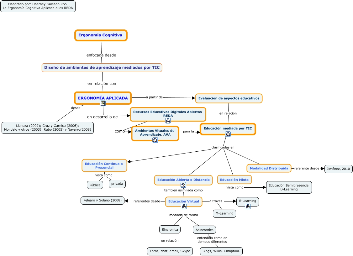 Este Cmap, tiene información relacionada con: Contenidos digitales. V1, Educación Abierta o Distancia tambien asimilada como Educación Virtual, ERGONOMÍA APLICADA a partir de Evaluación de aspectos educativos, Educación Continua o Presencial vista como privada, Modalidad Distribuida referente desde Jiménez, 2010, ERGONOMÍA APLICADA desde Llaneza (2007); Cruz y Garnica (2006); Mondelo y otros (2003); Rubo (2005) y Navarro(2008), Educación Virtual mediada de forma Asincroníca, Ambientes Vituales de Aprendizaje. AVA para la Educación mediada por TIC, ERGONOMÍA APLICADA en desarrollo de Recursos Educativos Digitales Abiertos REDA, Educación Continua o Presencial vista como Pública, Educación mediada por TIC clasificadas en Modalidad Distribuida, Educación Mixta vista como Educación Semipresencial B-Learning, Educación mediada por TIC clasificadas en Educación Mixta, Recursos Educativos Digitales Abiertos REDA como Ambientes Vituales de Aprendizaje. AVA, Educación Virtual a traves E-Learning, Asincroníca entendida como en tiempos diferentes Blogs, Wikis, Cmaptool., Educación Virtual a traves M-Learning, Sincroníca en relación Foros, chat, email, Skype, Educación mediada por TIC clasificadas en Educación Continua o Presencial, Educación mediada por TIC clasificadas en Educación Abierta o Distancia, Evaluación de aspectos educativos en relación Educación mediada por TIC