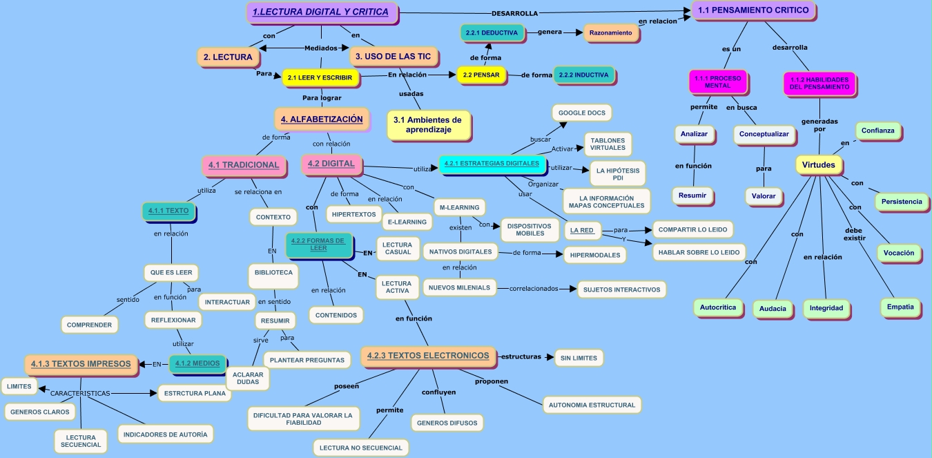 Este Cmap, tiene información relacionada con: LA LECTURA DIGITAL EN AMBIENTES DE APRENDIZAJE 3, 1.LECTURA DIGITAL Y CRITICA DESARROLLA 1.1 PENSAMIENTO CRITICO, RESUMIR para PLANTEAR PREGUNTAS, QUE ES LEER para INTERACTUAR, M-LEARNING existen NATIVOS DIGITALES, BIBLIOTECA en sentido RESUMIR, QUE ES LEER sentido COMPRENDER, 2. LECTURA Para 2.1 LEER Y ESCRIBIR, 1.LECTURA DIGITAL Y CRITICA en 3. USO DE LAS TIC, Virtudes con Autocritica, 1.LECTURA DIGITAL Y CRITICA Mediados 3. USO DE LAS TIC, 4.1.3 TEXTOS IMPRESOS CARACTERISTICAS GENEROS CLAROS, Virtudes con Vocación, 1.1.1 PROCESO MENTAL en busca Conceptualizar, Analizar en función Resumir, 4.2.1 ESTRATEGIAS DIGITALES usar LA RED, LA RED para COMPARTIR LO LEIDO, 4.1.3 TEXTOS IMPRESOS CARACTERISTICAS LIMITES, 4. ALFABETIZACIÓN con relación 4.2 DIGITAL, Razonamiento en relacion 1.1 PENSAMIENTO CRITICO, 2.2.1 DEDUCTIVA genera Razonamiento
