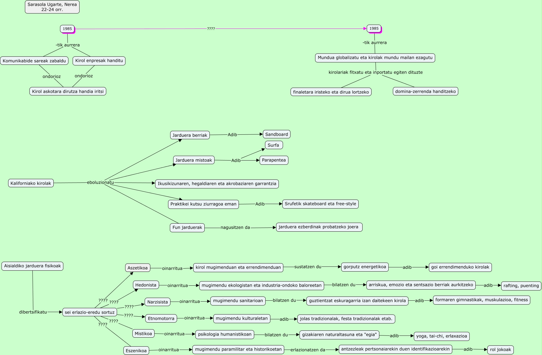 Este Cmap, tiene información relacionada con: PA1-Sarasola-KirolMod22-24, kirol mugimenduan eta errendimenduan sustatzen du gorputz energetikoa, sei erlazio-eredu sortuz ???? Eszenikoa, Jarduera mistoak Adib Parapentea, sei erlazio-eredu sortuz ???? Etnomotorra, Aisialdiko jarduera fisikoak dibertsifikatu sei erlazio-eredu sortuz, sei erlazio-eredu sortuz ???? Mistikoa, Narzisista oinarritua mugimendu sanitarioan, sei erlazio-eredu sortuz ???? Aszetikoa, Kaliforniako kirolak eboluzionatu Praktikei kutsu ziurragoa eman, Kaliforniako kirolak eboluzionatu Jarduera mistoak, sei erlazio-eredu sortuz ???? Narzisista, mugimendu paramilitar eta historikoetan erlazionatzen da antzezleak pertsonaiarekin duen identifikazioarekin, gizakiaren naturaltasuna eta "egia" adib yoga, tai-chi, erlaxazioa, Komunikabide sareak zabaldu ondorioz Kirol askotara dirutza handia iritsi, mugimendu ekologistan eta industria-ondoko baloreetan bilatzen du arriskua, emozio eta sentsazio berriak aurkitzeko, 1985 -tik aurrera Kirol enpresak handitu, Kirol enpresak handitu ondorioz Kirol askotara dirutza handia iritsi, Fun jarduerak nagusitzen da jarduera ezberdinak probatzeko joera, psikologia humanistikoan bilatzen du gizakiaren naturaltasuna eta "egia", guztientzat eskuragarria izan daitekeen kirola adib formaren gimnastikak, muskulazioa, fitness
