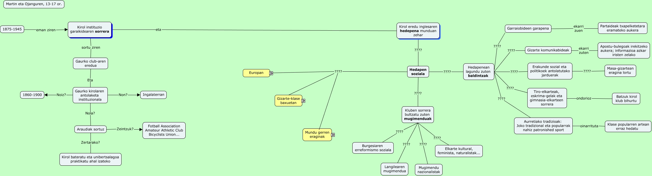 Este Cmap, tiene información relacionada con: PA2- Martin, Kirola deibertsifikatu ???? Kirol bakarreko klubak, Bigarren mundu gerra ???? ????, Gizarte klase baxuetan zabaldu zen Kirol praktika eta ikuskizuna, Bigarren mundu gerra ???? Kirol mugimendu eta fererakunde aniztasuna murriztu, Kirol burgesa ???? Lekuko burgesek osatutako klubak, Kirol mugimendu eta fererakunde aniztasuna murriztu ondorioz Kirolaren antolaketa estatuaren menpean jarri, Aurretiako tradizioak: Joko tradizional eta popularrak nahiz patronished sport oinarrituta Klase popularren artean erraz hedatu, Hedapen soziala ???? Gizarte-klase baxuetan, Gaurko kirolaren antolaketa instituzionala Nola? Araudiak sortuz, Gaurko club-aren eredua Eta Gaurko kirolaren antolaketa instituzionala, Hedapenean lagundu zuten baldintzak ???? Tiro-elkarteak, eskrima-gelak eta gimnasia-elkarteen sorrera, Araudiak sortuz Zertarako? Kirol bateratu eta unibertsalagoa praktikatu ahal izateko, Mundu gerren eragina ???? Bigarren mundu gerra, Garraiobideen garapena ekarri zuen Partaideak txapelketetara eramateko aukera, Hedapen soziala ???? Kluben sorrera bultzatu zuten mugimenduak, Kirola deibertsifikatu Kirol burgesa, Hedapen soziala ???? Mundu gerren eragina, 1875-1945 eman ziren Kirol instituzio garaikidearen sorrera, Gaurko kirolaren antolaketa instituzionala Non? Ingalaterran, Lehenengo mundu gerra ???? Armadek kirol jarduerak eta txapelketak antolatu