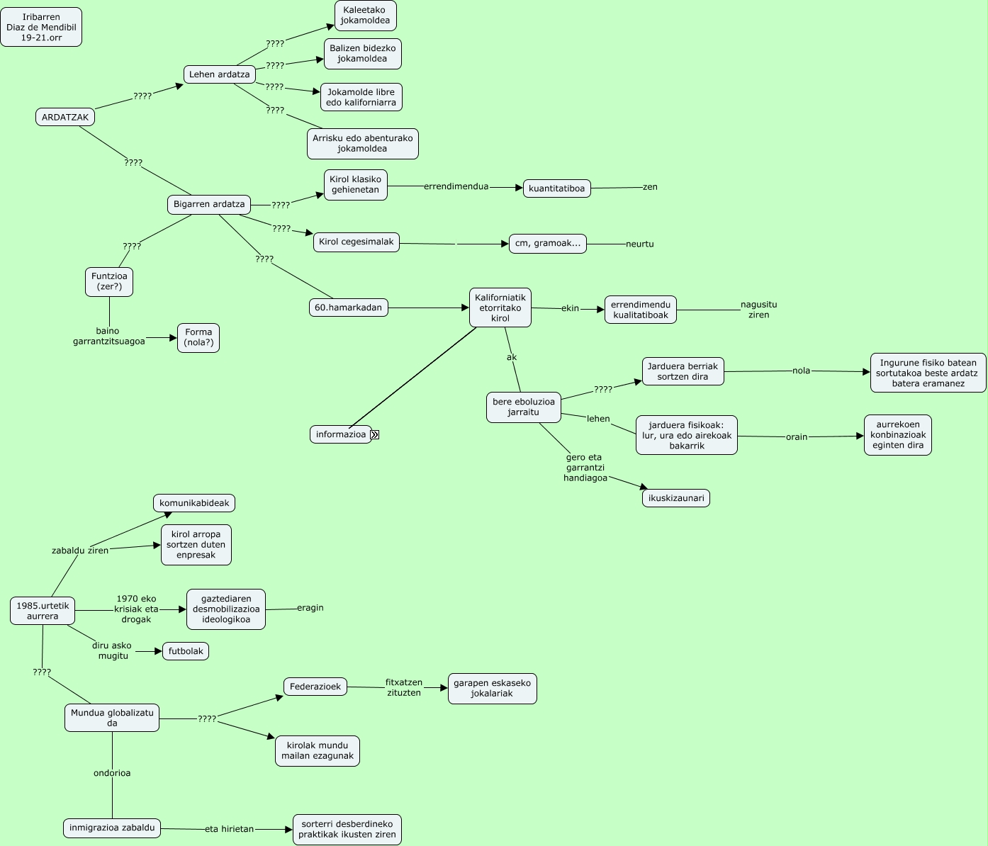 Este Cmap, tiene información relacionada con: PA1-Iribarren-KirolMod2-C, Funtzioa (zer?) baino garrantzitsuagoa Forma (nola?), Kaliforniatik etorritako kirol etan klubak sortu, bere eboluzioa jarraitu ???? Jarduera berriak sortzen dira, jarduera fisikoak: lur, ura edo airekoak bakarrik orain aurrekoen konbinazioak eginten dira, Mundua globalizatu da ???? kirolak mundu mailan ezagunak, Mundua globalizatu da ???? Federazioek, ARDATZAK ???? Bigarren ardatza, askeak ondoren inguruko elementuek (arropa...), 1985.urtetik aurrera ???? Mundua globalizatu da, Kirol klasiko gehienetan errendimendua kuantitatiboa, Bigarren ardatza ???? 60.hamarkadan, inguruko elementuek (arropa...) interes komertziala sortu zuten, Kaliforniatik etorritako kirol ekin errendimendu kualitatiboak, bere eboluzioa jarraitu lehen jarduera fisikoak: lur, ura edo airekoak bakarrik, klubak sortu zergatik? materiala, garraioa..., Mundua globalizatu da ondorioa inmigrazioa zabaldu, Bigarren ardatza ???? Kirol klasiko gehienetan, Lehen ardatza ???? Jokamolde libre edo kaliforniarra, Lehen ardatza ???? Balizen bidezko jokamoldea, Kirol cegesimalak cm, gramoak...