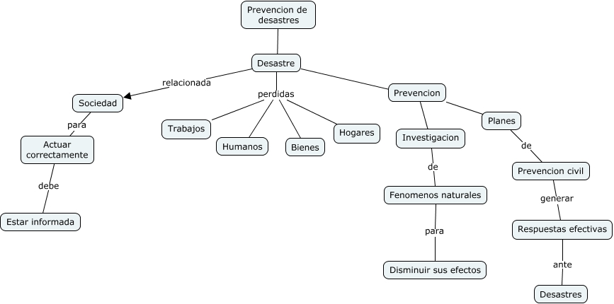 Este Cmap, tiene información relacionada con: Prevencion de desastres, Actuar correctamente debe Estar informada, Prevencion ???? Investigacion, Desastre relacionada Sociedad, Desastre perdidas Hogares, Respuestas efectivas ante Desastres, Planes de Prevencion civil, Desastre perdidas Bienes, Desastre perdidas Humanos, Prevencion civil generar Respuestas efectivas, Prevencion ???? Planes, Investigacion de Fenomenos naturales, Desastre perdidas Trabajos, Sociedad para Actuar correctamente, Desastre ???? Prevencion, Fenomenos naturales para Disminuir sus efectos, Prevencion de desastres ???? Desastre